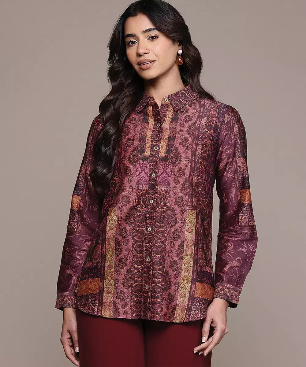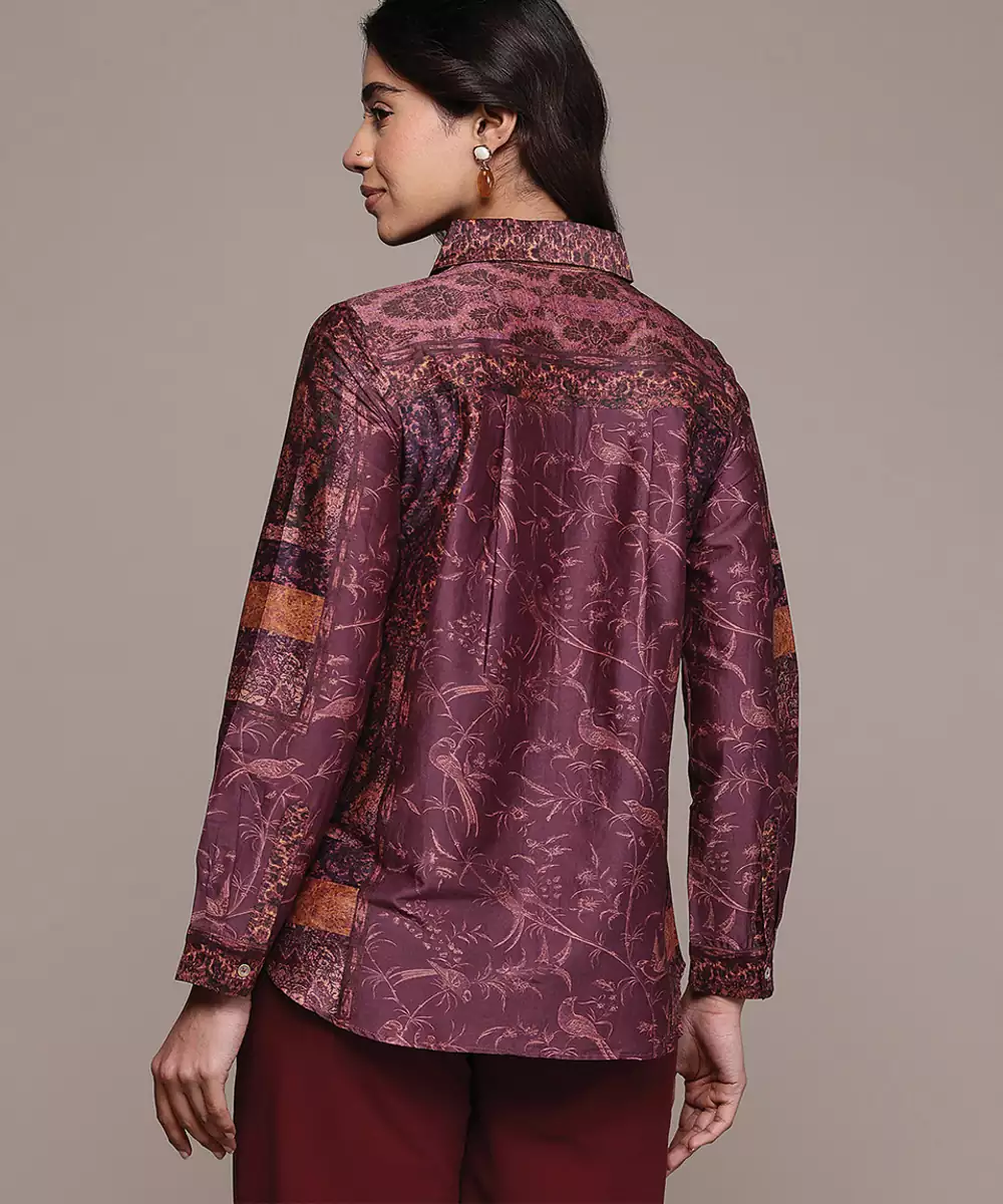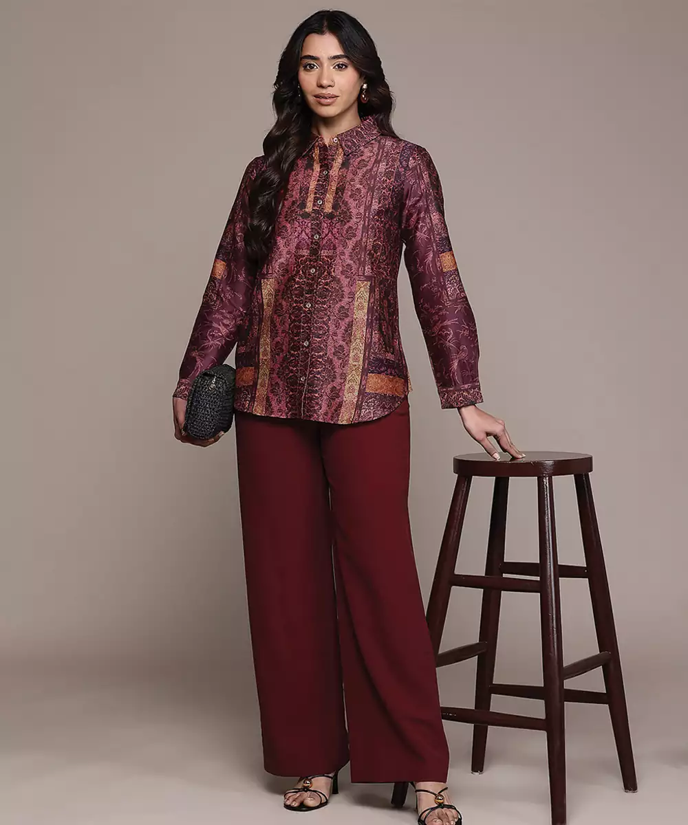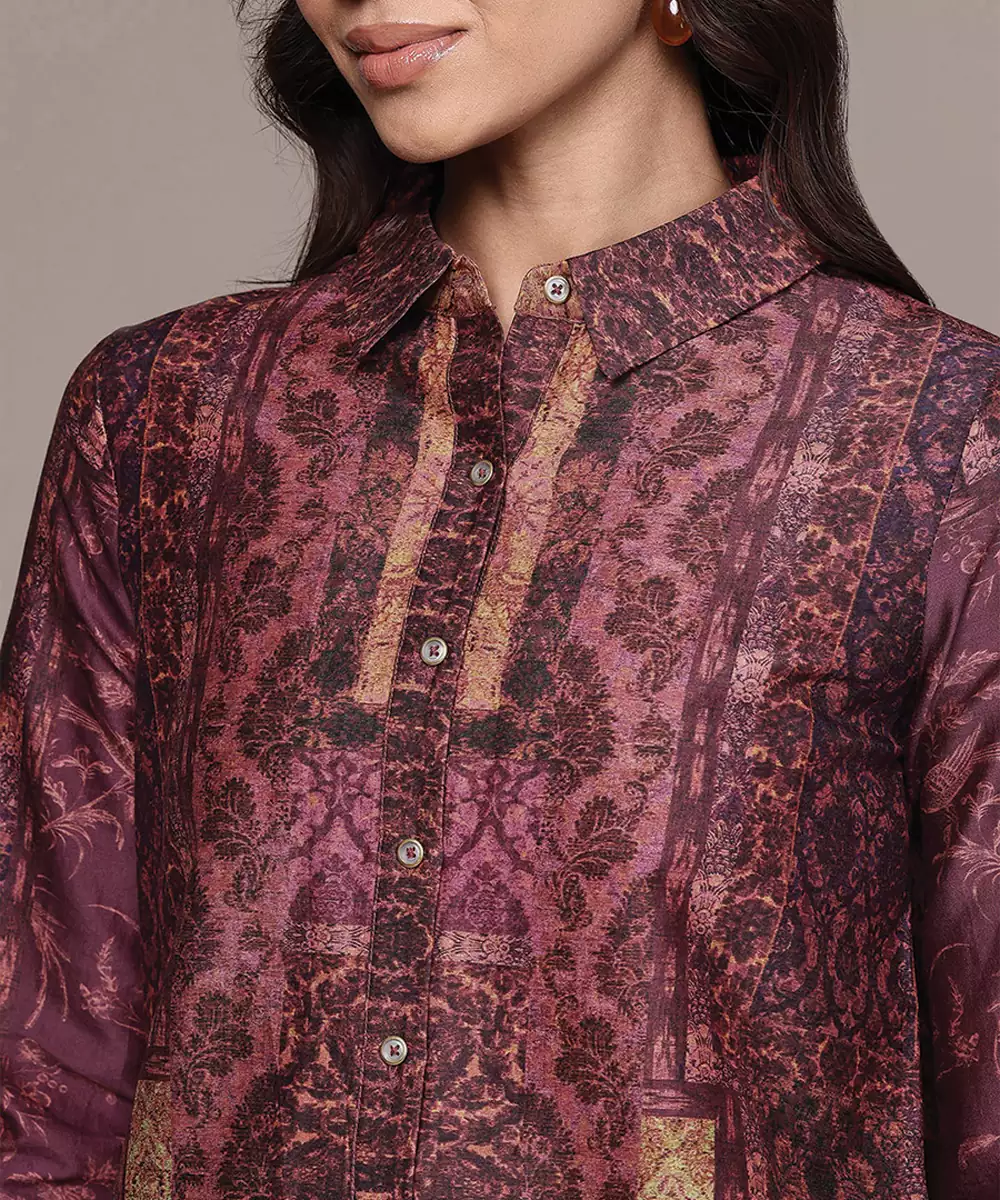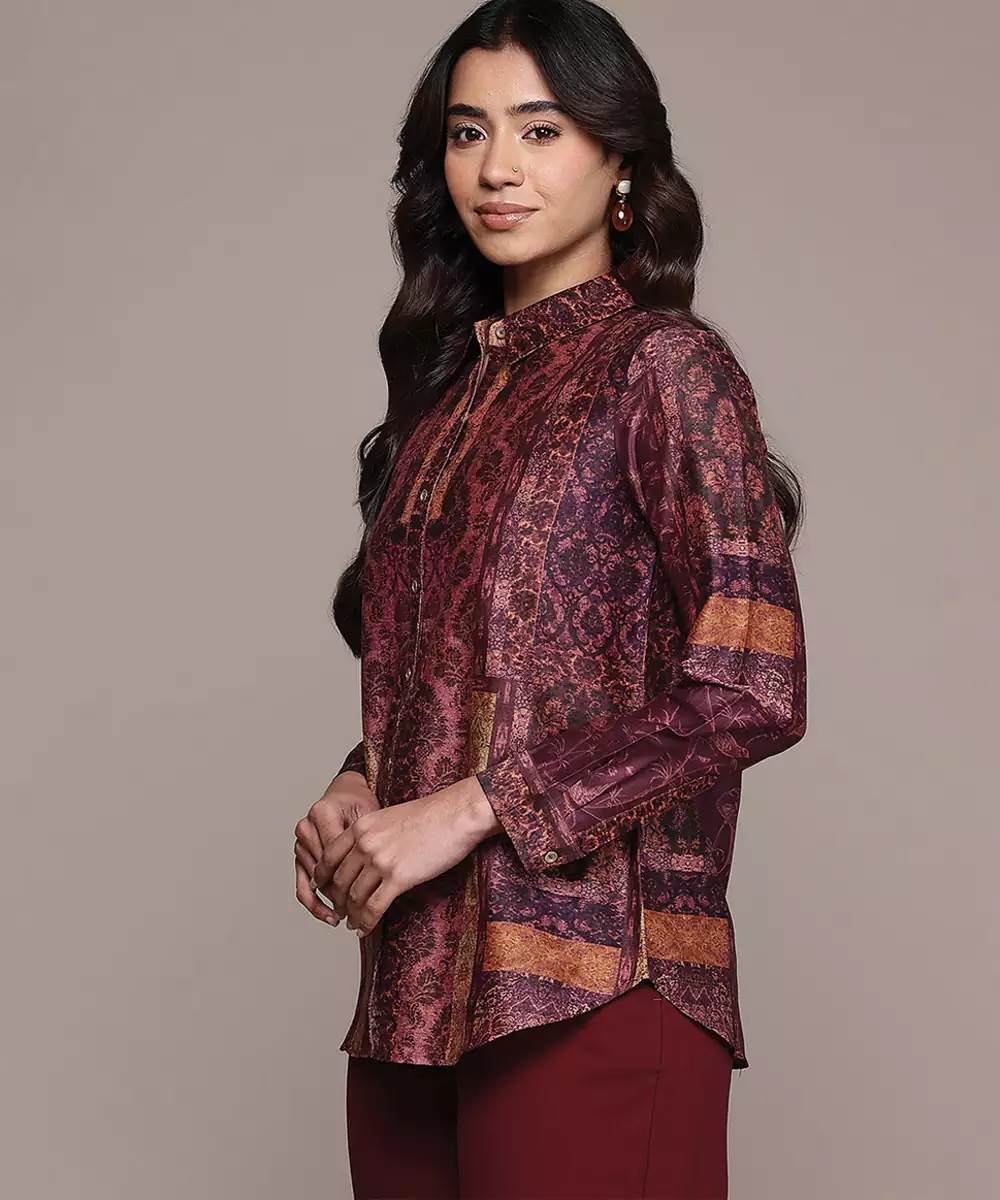 This Wine Printed Chanderi Shirt Features A Rich Hue With A Subtle Sheen And Elegant Patterns. The Lightweight Fabric Ensures Comfort, While The Refined Design Adds A Sophisticated Touch. Perfect For Both Casual And Semi Formal Styling, It Offers A Unique Blend Of Traditional Texture And Modern Fashion.