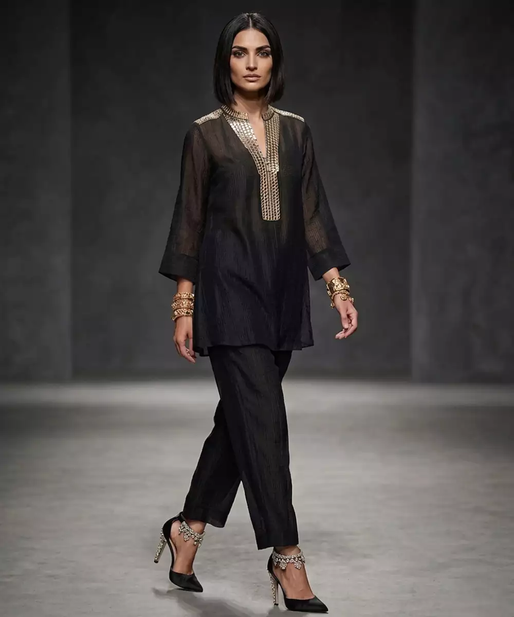 This Black Lurex Kurta Set Features Intricate Embroidery That Adds Sophistication And Sparkle. The Fabric Offers A Subtle Shimmer, While The Silhouette Ensures Comfort And Elegance. Perfect For Evening Events Or Festive Occasions, It Pairs Effortlessly With Bold Accessories For A Striking Look.