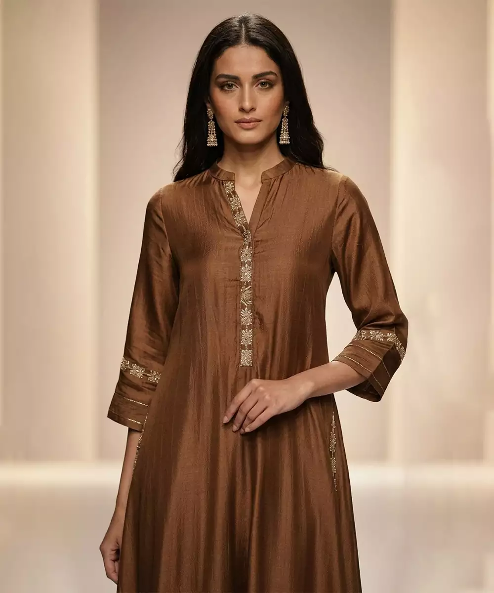 This Brown Embroidered Chanderi Anarkali Kurta Set Showcases Timeless Elegance With Intricate Detailing. Crafted From Lightweight Chanderi Fabric, It Offers A Graceful Flow And Comfortable Feel. The Delicate Embroidery Enhances Its Festive Appeal, Making It Ideal For Weddings, Cultural Celebrations, And Traditional Occasions With Refined Ethnic Charm.