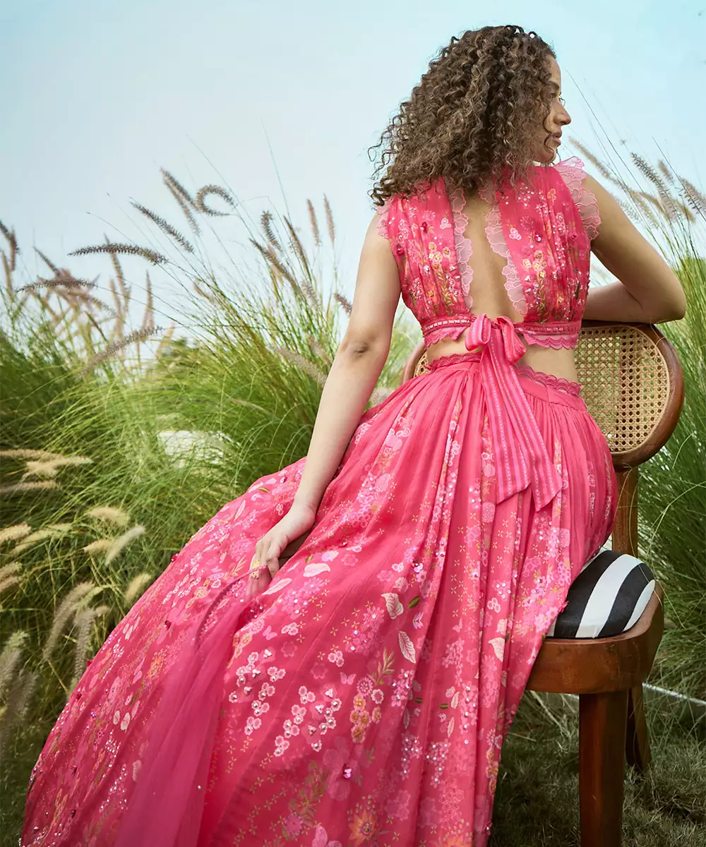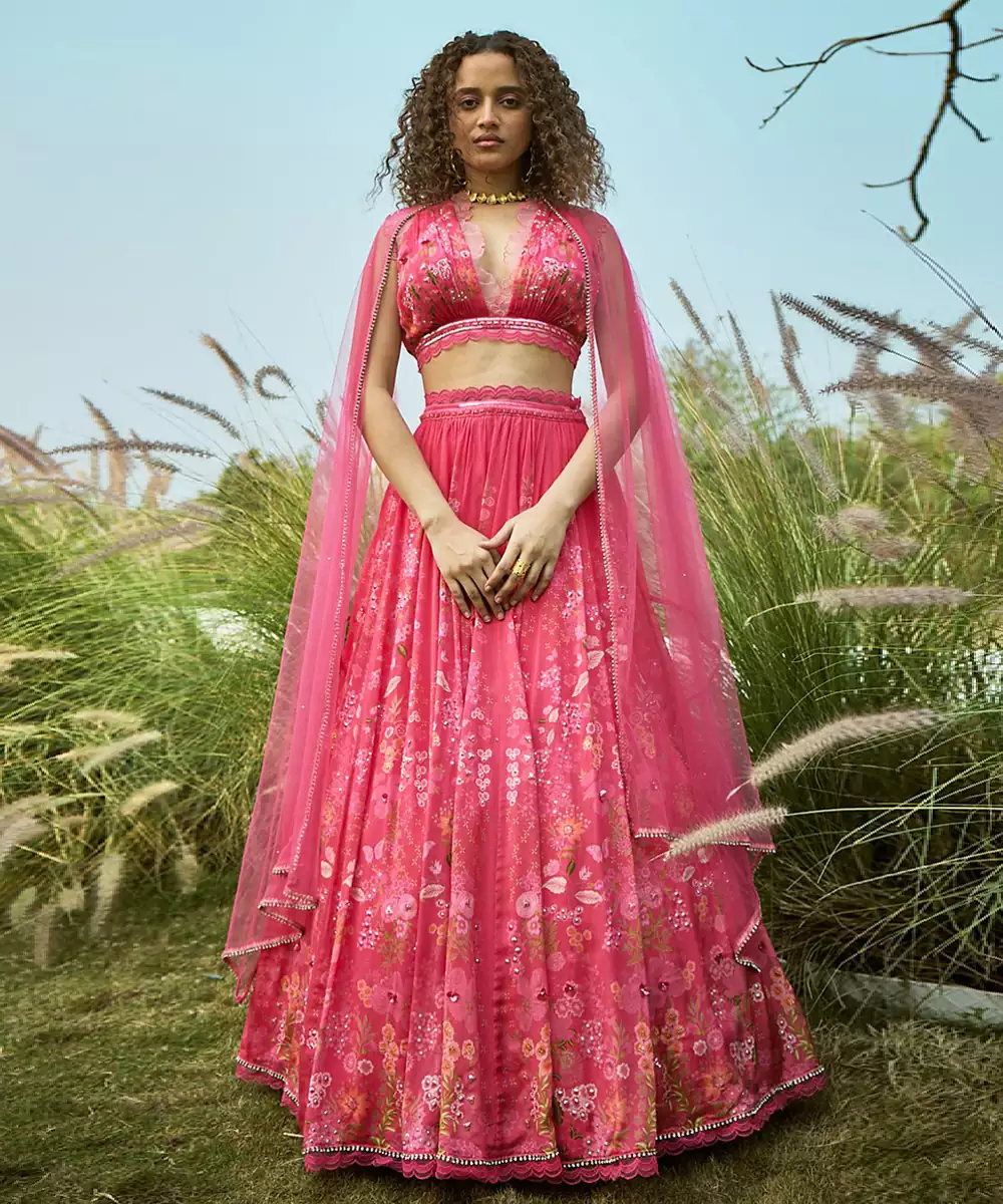 This Pink Chiffon Lehenga Set Showcases Soft Floral Prints That Add A Romantic And Feminine Touch. The Lightweight Fabric Drapes Beautifully, Offering Comfort And Elegance. Ideal For Daytime Celebrations Or Festive Occasions, It Pairs Effortlessly With Minimal Accessories For A Graceful And Effortlessly Stylish Look.
