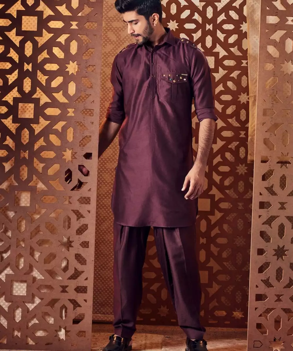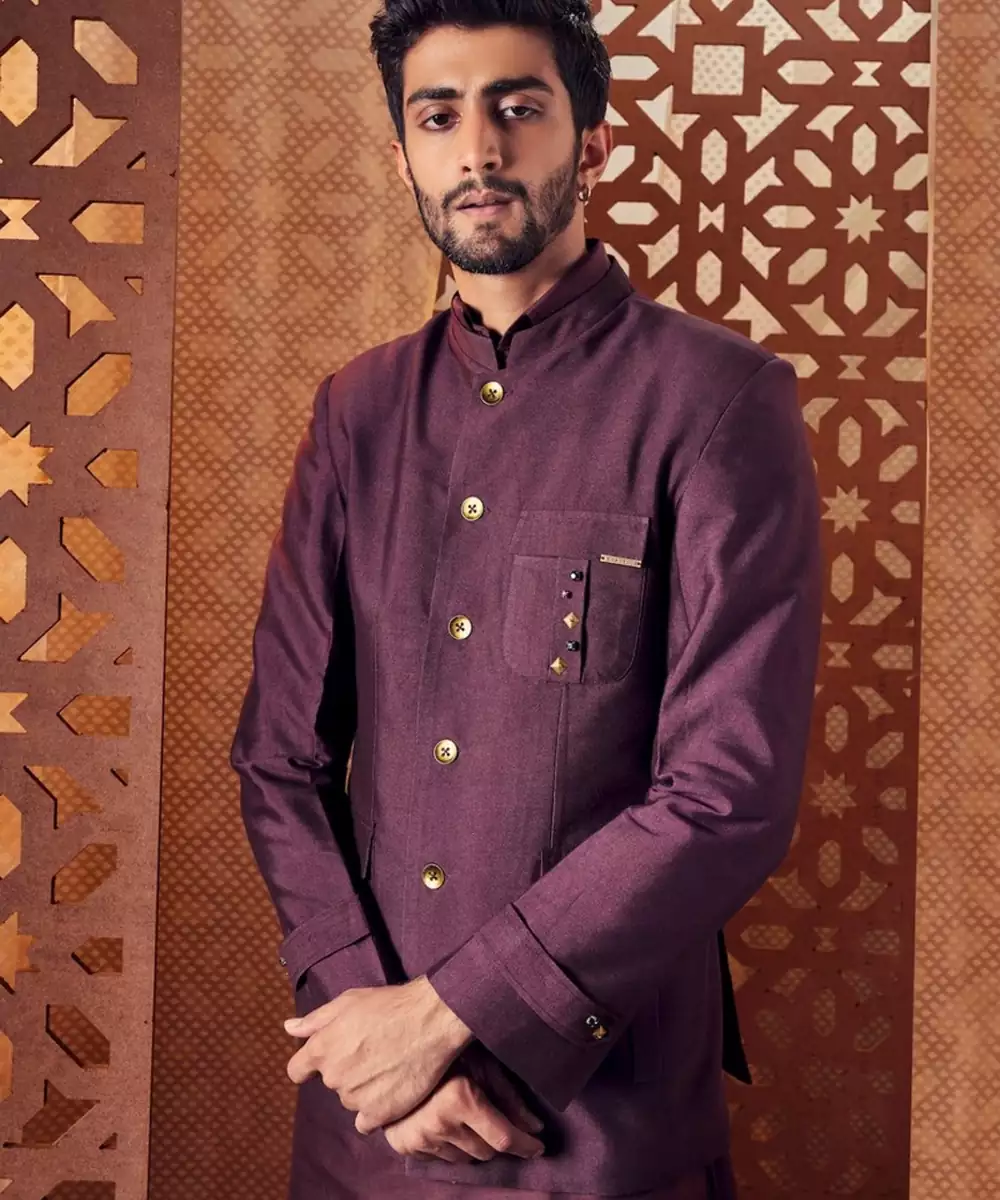 Our Classic Chanderi Pathani And Bandhgala Set In Choco Brown Is The Perfect Occasion Wear. The Kurta Features, Classic Shirt Collar, Loops On Shoulder & Folded Sleeves And Round Shape Bottom. Subtly Enhanced With Studs And Gems On Pocket And Shoulder Loops. Perfectly Pired With Our Chocolate Bandhgal Crafted In Fine Banana Silk Fabric, The Look Is Elevated With Studs And Gems Highlighting On Chest Pocket And Collar. The Monochrome Set Come With The Same Color Salwar.