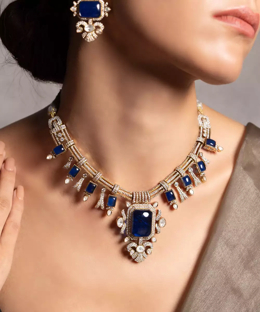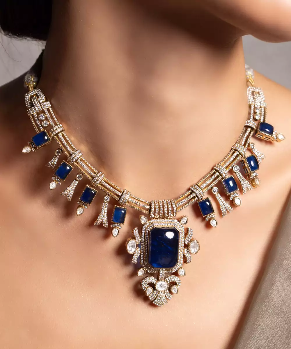 Featuring Navy Enamel, Kundan Work, And Pearl Detailing, This Majestic Necklace Set Radiates Sophistication. Perfect For Receptions Or Regal Evening Celebrations, It Adds Undeniable Drama And Poise.