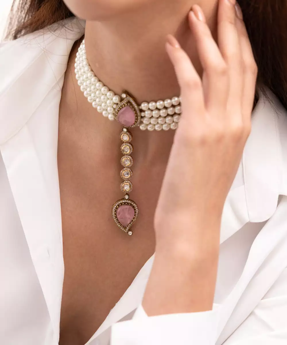 This Ivory Hued Beaded Choker Features A Delicate Central Drop With Multicolored Gemstone Accents. Subtle Yet Striking, It's Ideal For Evening Soirées Or As A Complement To Embroidered Ethnic Wear.