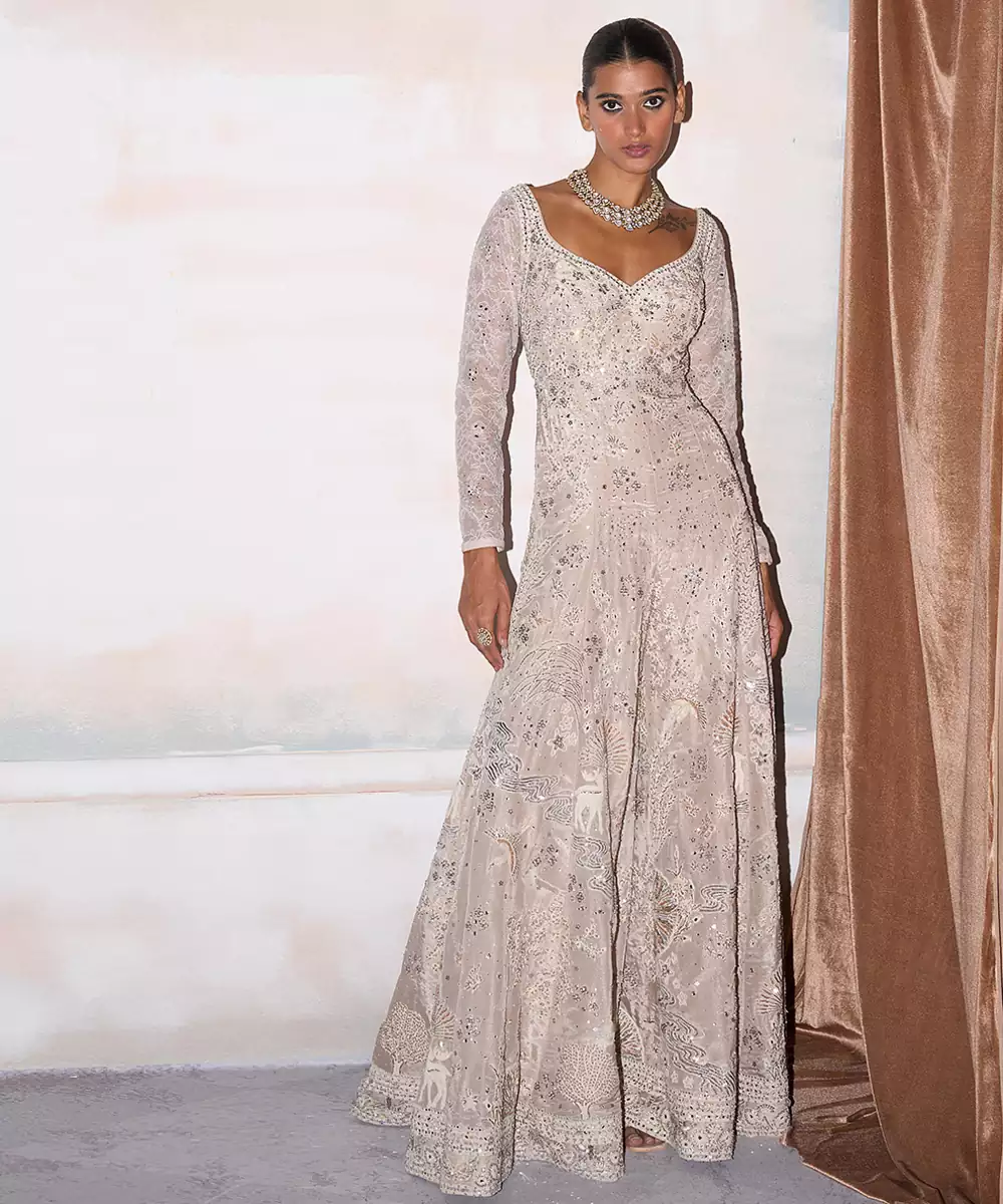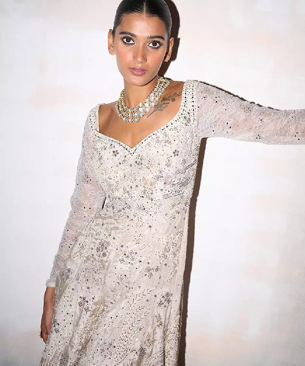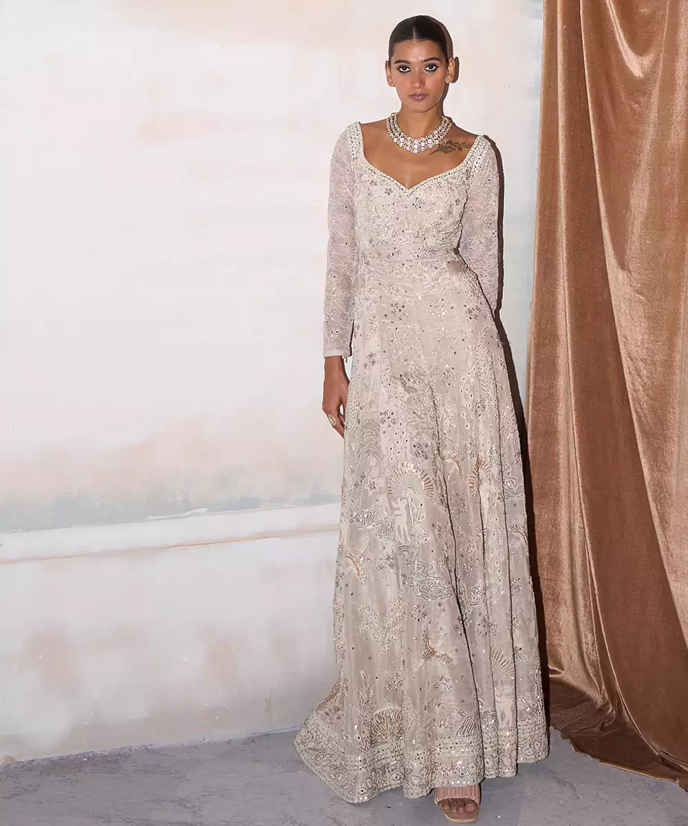 This Ivory Embroidered Tissue Silk Jumpsuit Showcases A Subtle Sheen With Refined Detailing. The Elegant Silhouette Offers A Contemporary Look, While The Lightweight Fabric Ensures Comfort. Perfect For Festive Occasions, It Delivers A Graceful And Modern Ethnic Style.