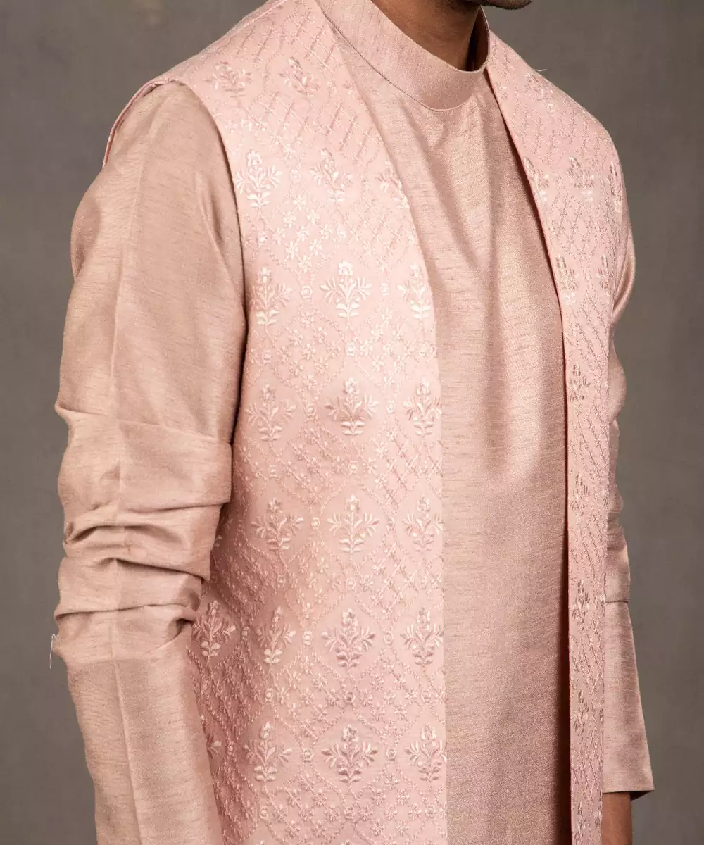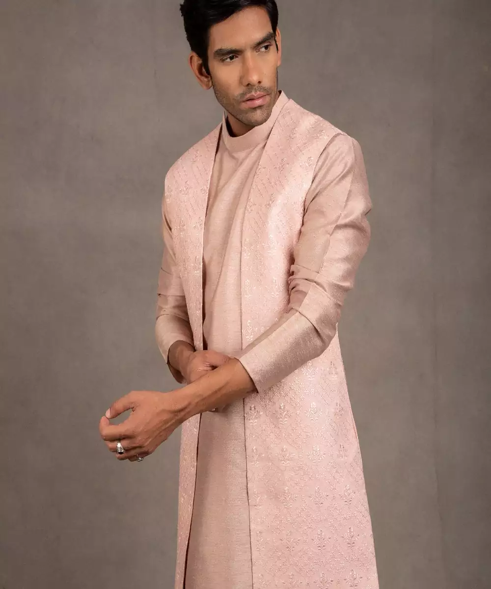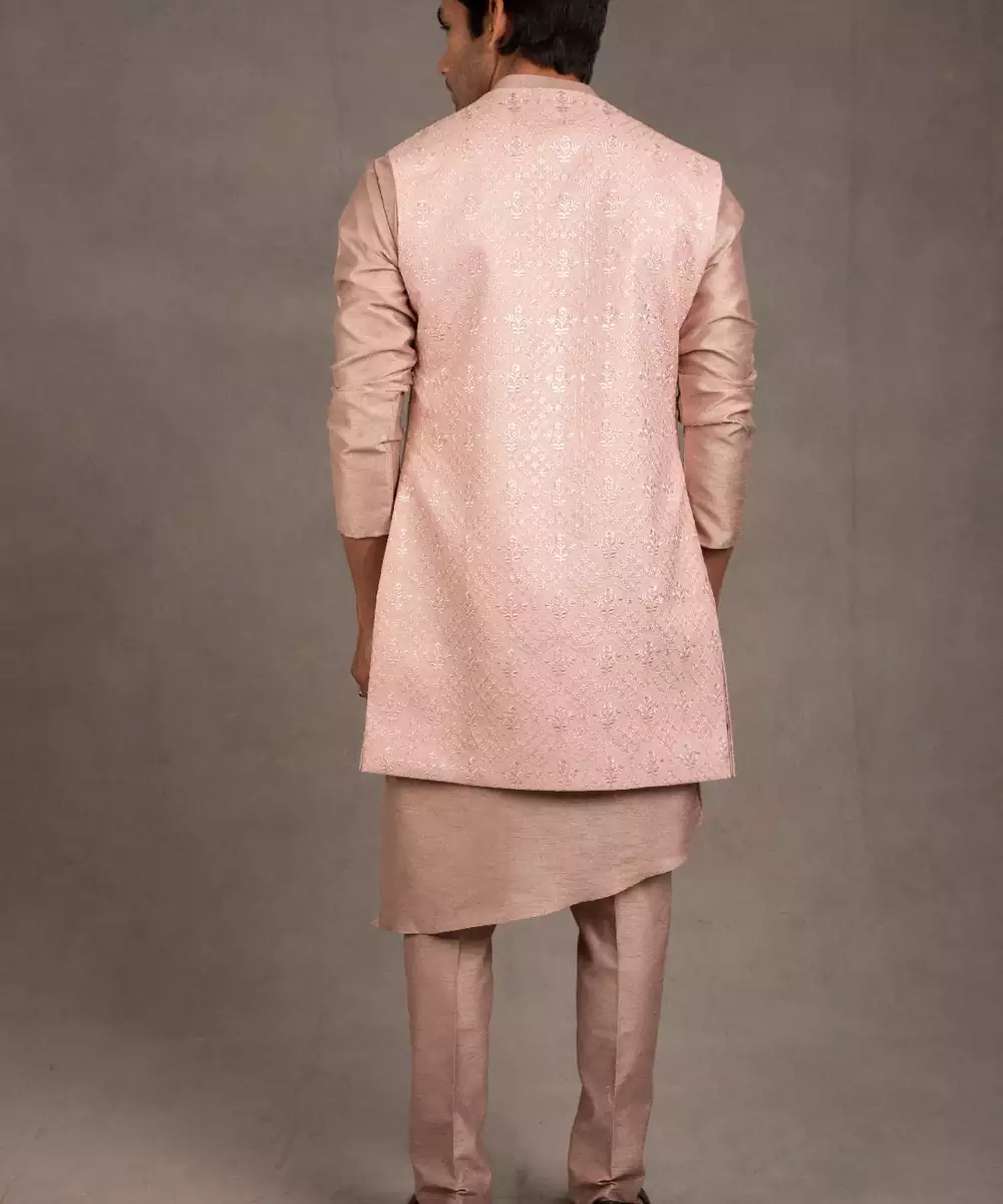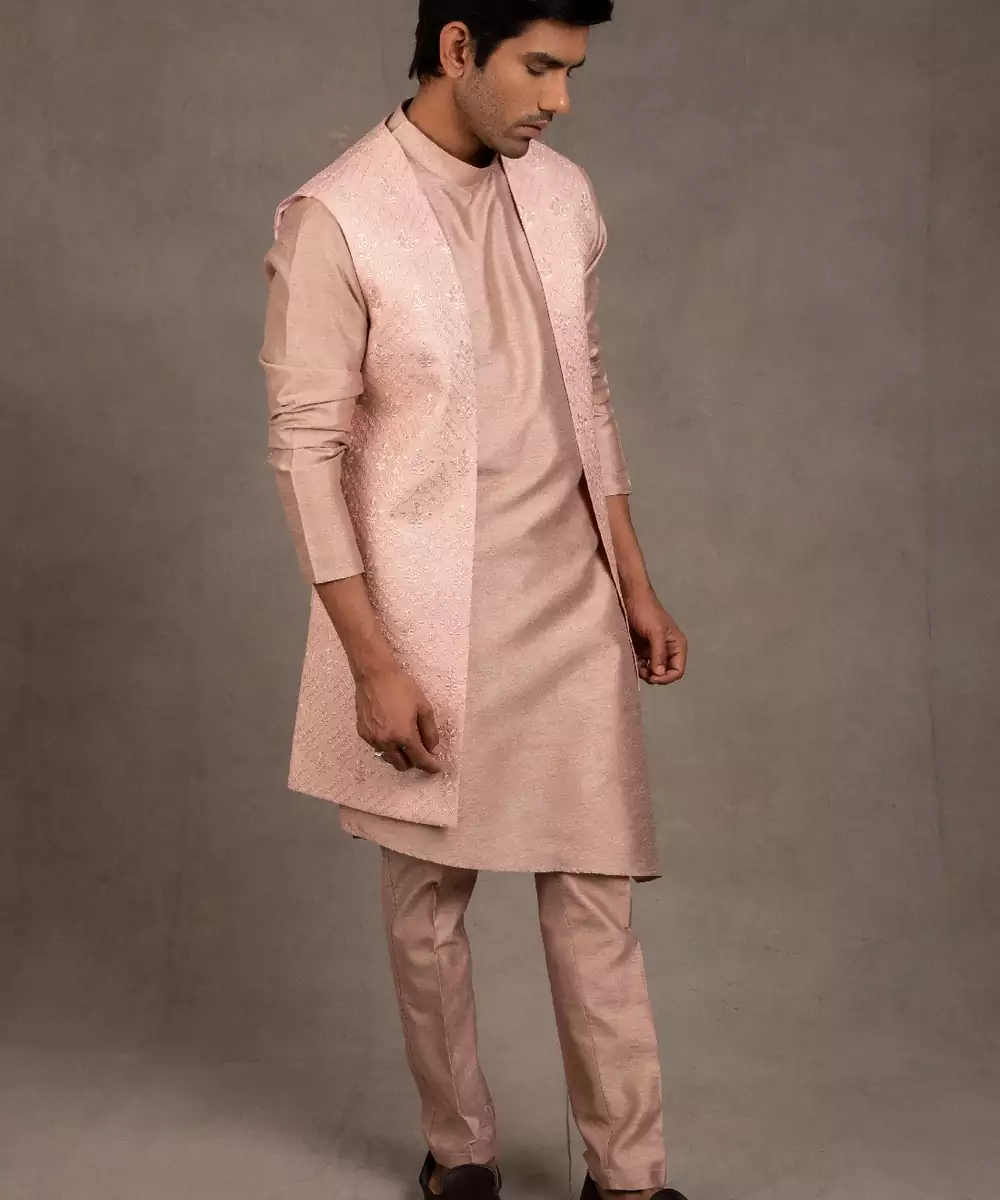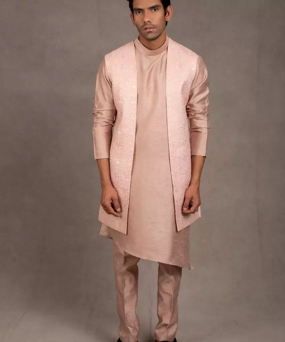 Dusty Rose Raw Silk Long Open Shrug Enhanced With All Over Tone On Tone Thread Embroidery Paired With A Dusty Rose Asymmetric Dupion Silk High Collar Kurta And A Dusty Rose Dupion Silk Mexican Pant.