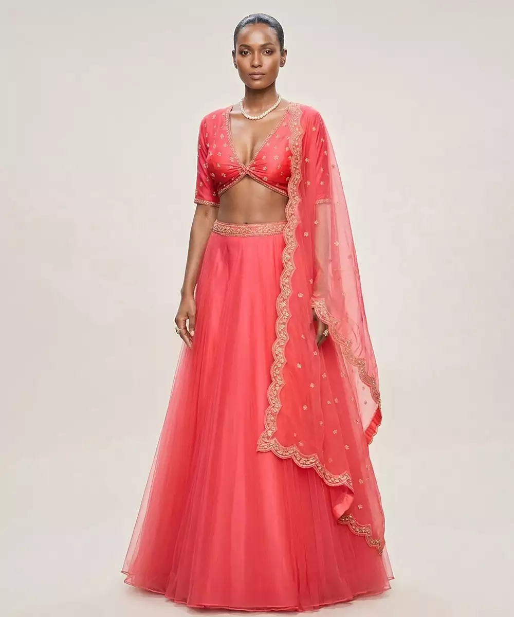 This Coral Pink Organza Lehenga Set Showcases Intricate Embroidery That Adds Charm And Elegance. The Sheer Fabric Offers A Lightweight And Graceful Drape. Ideal For Festive Occasions, It Pairs Effortlessly With Minimal Accessories For A Chic And Feminine Look.