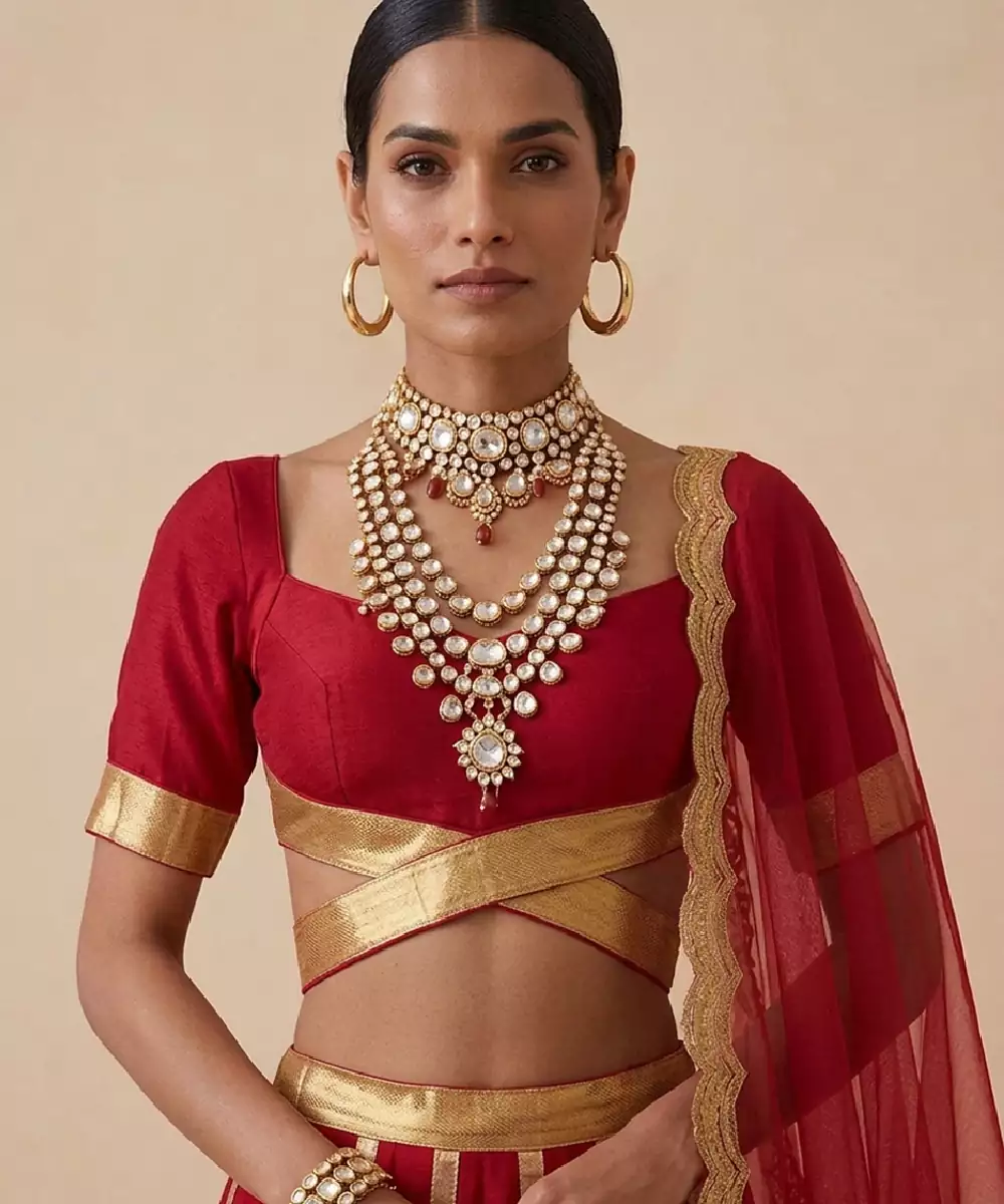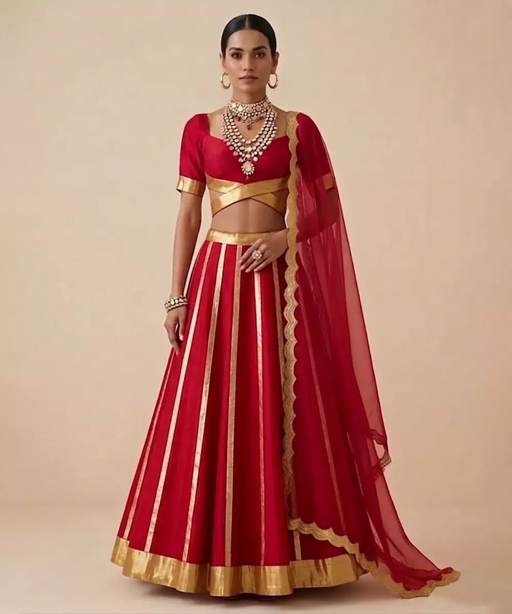 This Crimson Red Raw Silk Lehenga Set Features Intricate Embroidery That Enhances Its Rich And Regal Appeal. The Structured Silhouette And Luxurious Texture Create A Graceful Drape, Perfect For Weddings And Grand Celebrations. Pair It With Traditional Jewelry To Achieve A Bold, Elegant, And Timeless Festive Look.