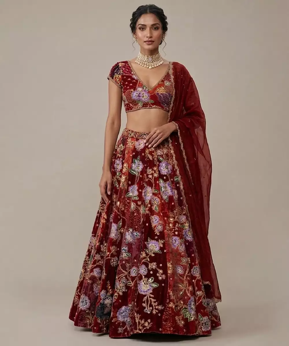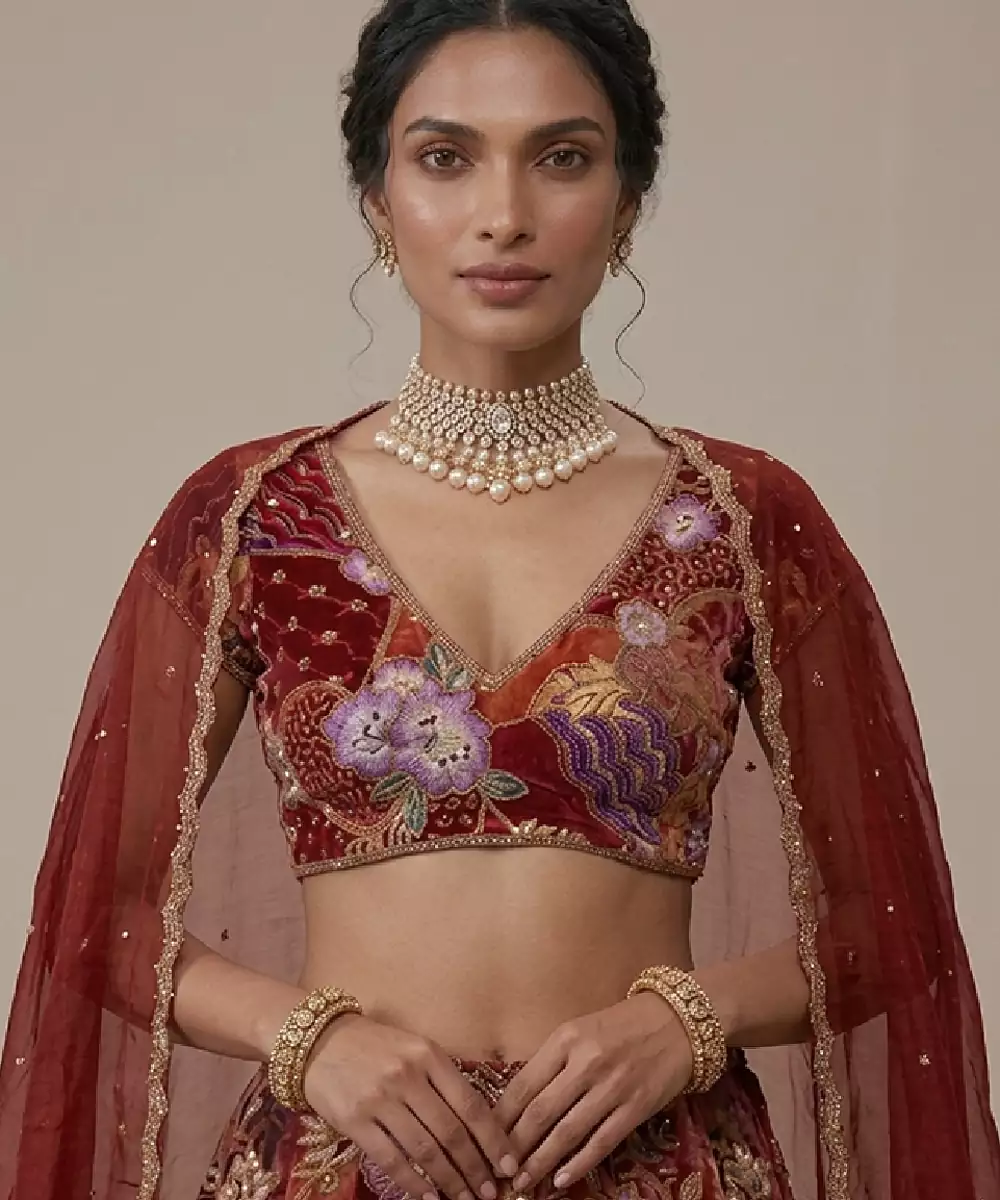 Maroon Embroidered Crepe Lehenga Set