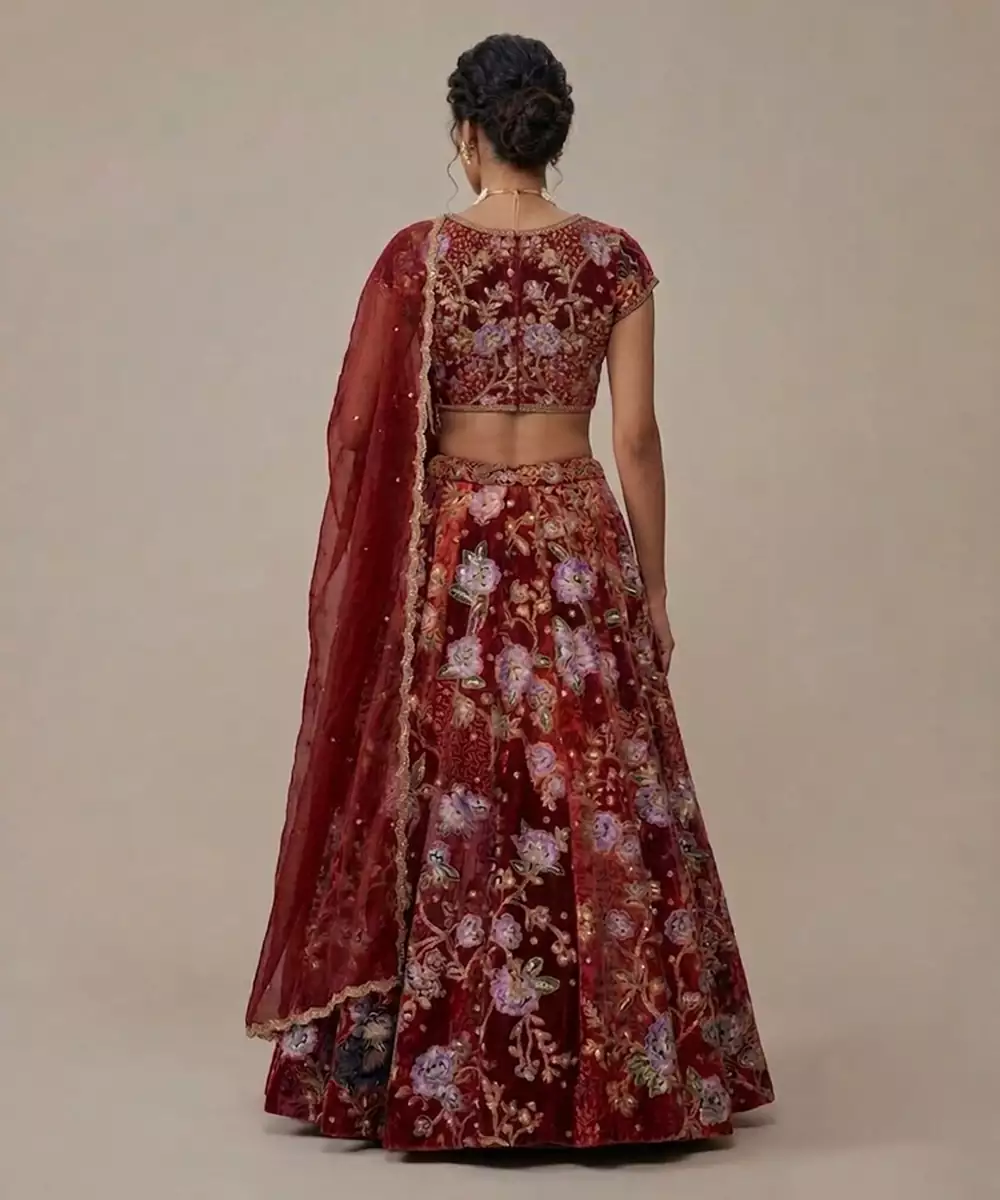 This Maroon Crepe Lehenga Set Showcases Intricate Embroidery That Adds Richness And Elegance. The Lightweight Fabric Ensures Comfort While Maintaining A Graceful Silhouette. Perfect For Festive Occasions, It Pairs Effortlessly With Statement Jewelry For A Timeless And Sophisticated Appearance.