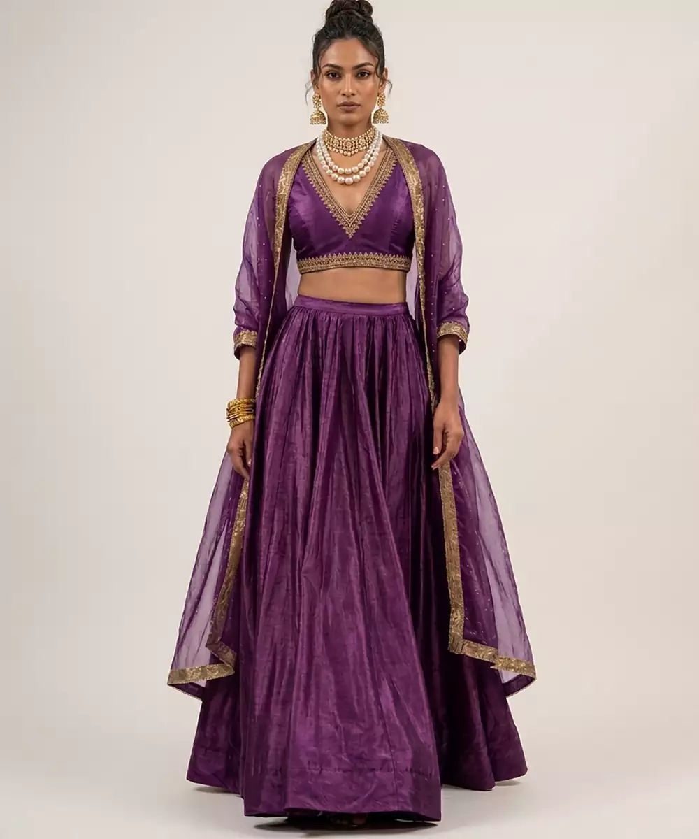 This Royal Purple Silk Lehenga Set Showcases A Rich Hue And Luxurious Texture That Enhances Its Regal Appeal. The Elegant Silhouette Makes It Perfect For Weddings And Festive Occasions. Pair It With Traditional Jewelry For A Bold And Timeless Look.