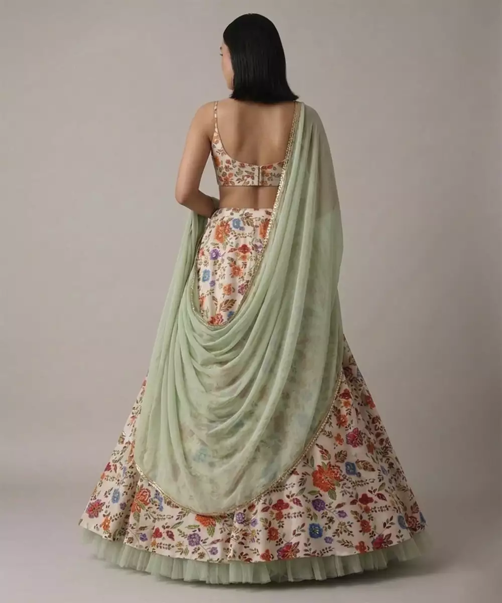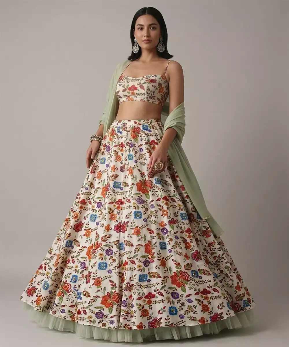 This Ivory Crepe Lehenga Set Showcases Delicate Floral Prints That Add A Soft And Feminine Touch. The Lightweight Fabric Drapes Beautifully, Offering Comfort And Elegance. Ideal For Daytime Events Or Festive Gatherings, It Pairs Effortlessly With Subtle Accessories For A Graceful And Charming Ensemble.