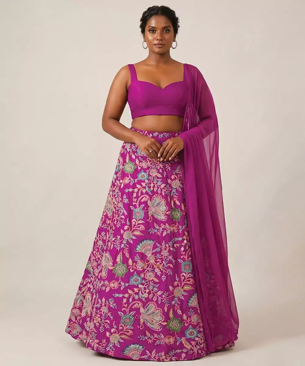 This Magenta Pink Crepe Lehenga Set Showcases Vibrant Prints That Enhance Its Bold And Festive Appeal. The Lightweight Fabric Ensures Comfort, While The Flowing Silhouette Adds Elegance. Ideal For Celebrations, It Pairs Effortlessly With Minimal Or Statement Accessories For A Striking And Stylish Look.