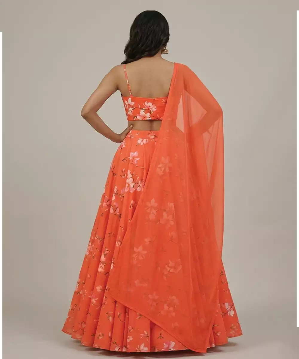 This Orange Georgette Lehenga Set Features Vibrant Floral Prints That Enhance Its Lively Appeal. The Lightweight Fabric Drapes Gracefully, Offering Comfort And Elegance. Perfect For Festive Occasions Or Celebrations, It Pairs Effortlessly With Subtle Accessories For A Bright And Stylish Look.