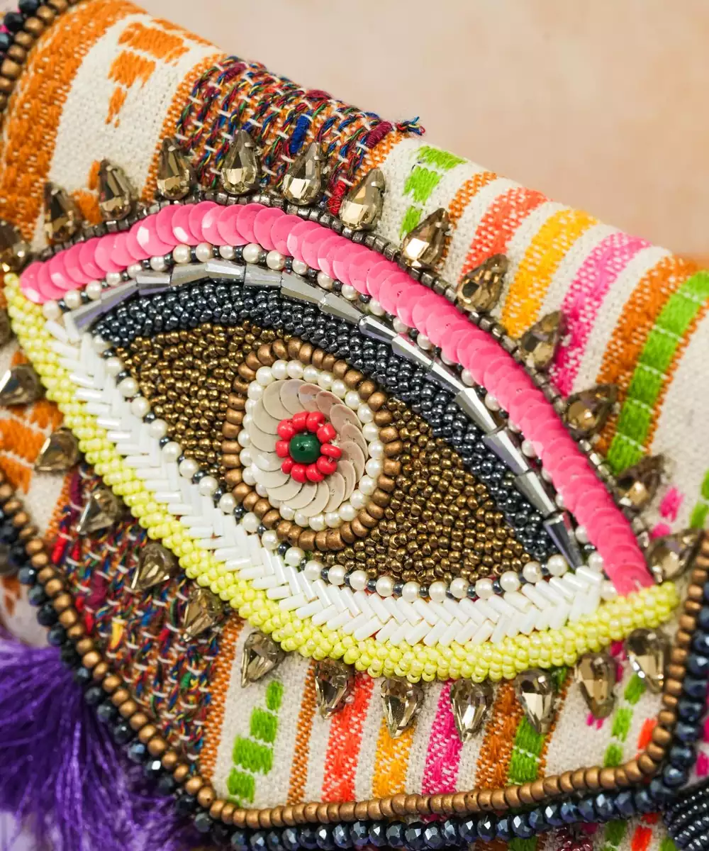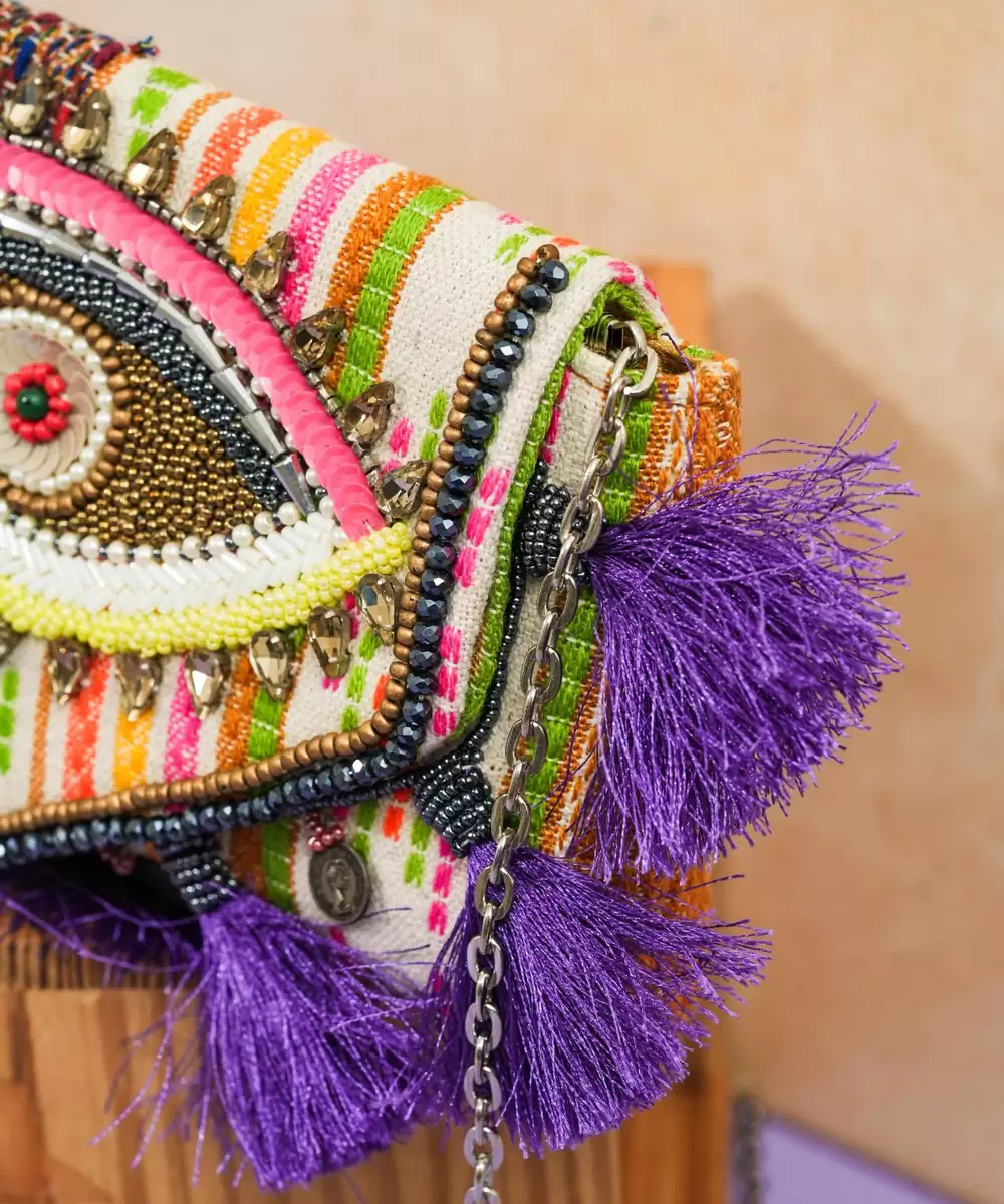 This Multicolor Jacquard Beads Embroidered Clutch Is A Striking Accessory That Combines Vibrant Design With Elegant Craftsmanship. Made From Premium Jacquard Fabric, It Features Intricate Bead Embroidery In Multiple Colors, Adding A Festive Sparkle. Compact And Secure, It Is Perfect For Weddings, Parties, And Special Occasions, Complementing Both Traditional And Contemporary Outfits.