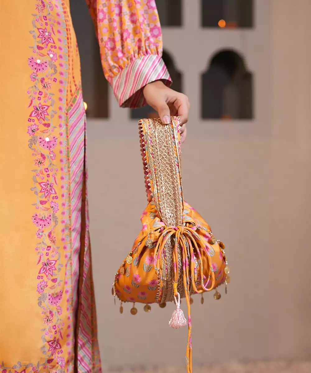 The Vibrant Yellow Hue Makes It A Perfect Complement To Festive And Wedding Ensembles, While The Detailed Craftsmanship Adds A Refined, Designer Touch. The Drawstring Closure Keeps Your Essentials Secure, And The Decorative Tassels Add Graceful Movement And Traditional Flair.