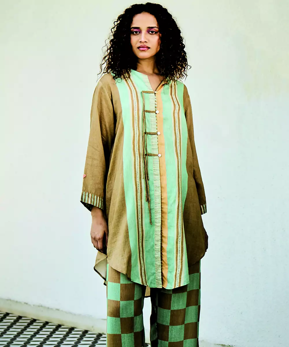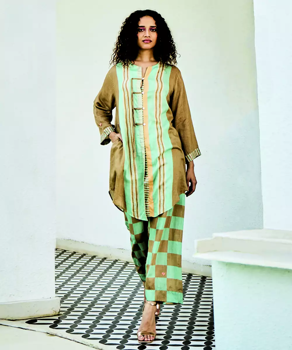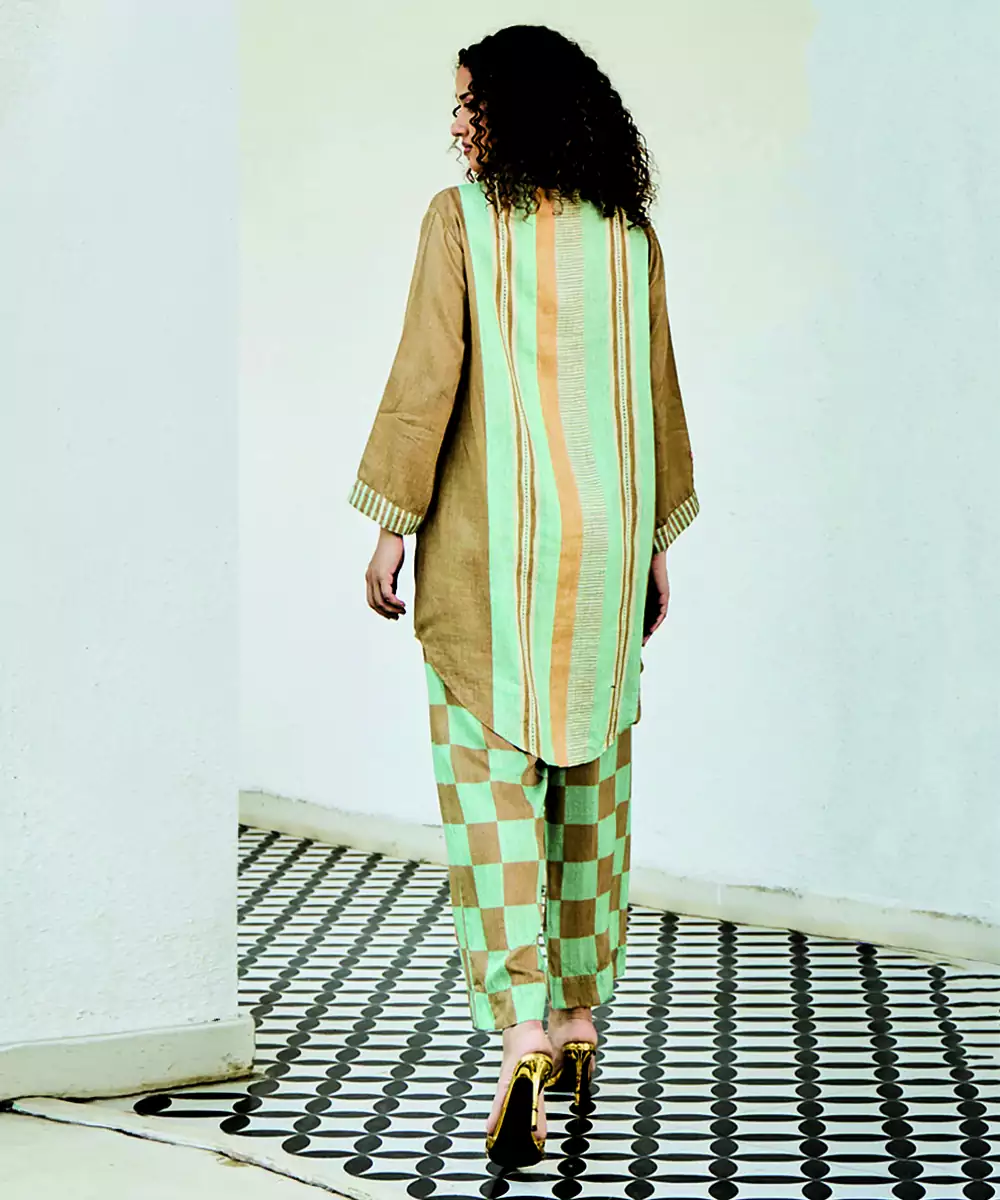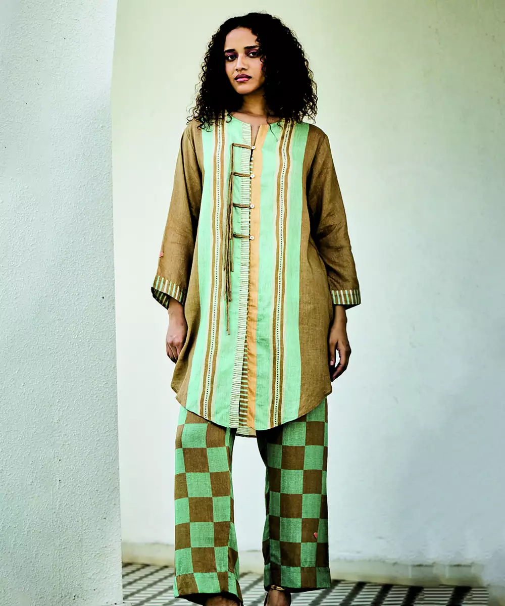 This Brown Linen Kurta Set Showcases Earthy Prints That Enhance Its Natural Appeal. The Breathable Fabric Ensures Comfort, While The Design Offers A Relaxed Fit. Ideal For Casual Outings, It Pairs Effortlessly With Simple Accessories For A Stylish And Easygoing Everyday Look.
