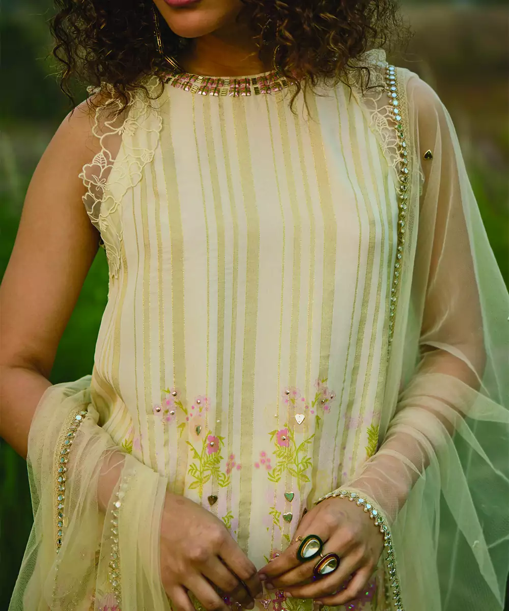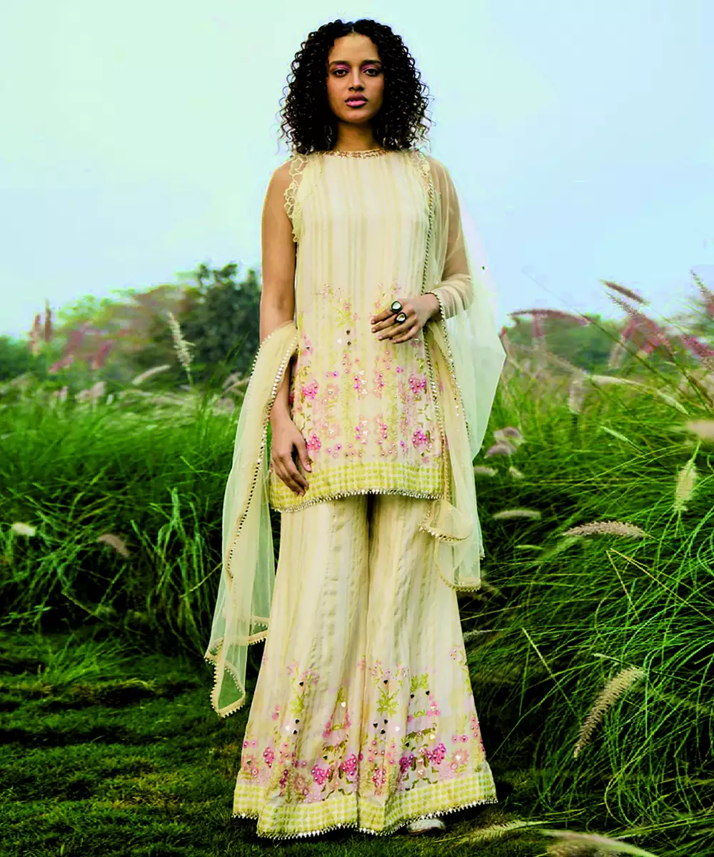 This Cream Net Sharara Set Showcases Intricate Embroidery That Adds A Touch Of Elegance. The Lightweight Fabric And Flared Sharara Create A Graceful Silhouette. Perfect For Festive Occasions Or Celebrations, It Pairs Beautifully With Statement Jewelry For A Sophisticated And Timeless Look.