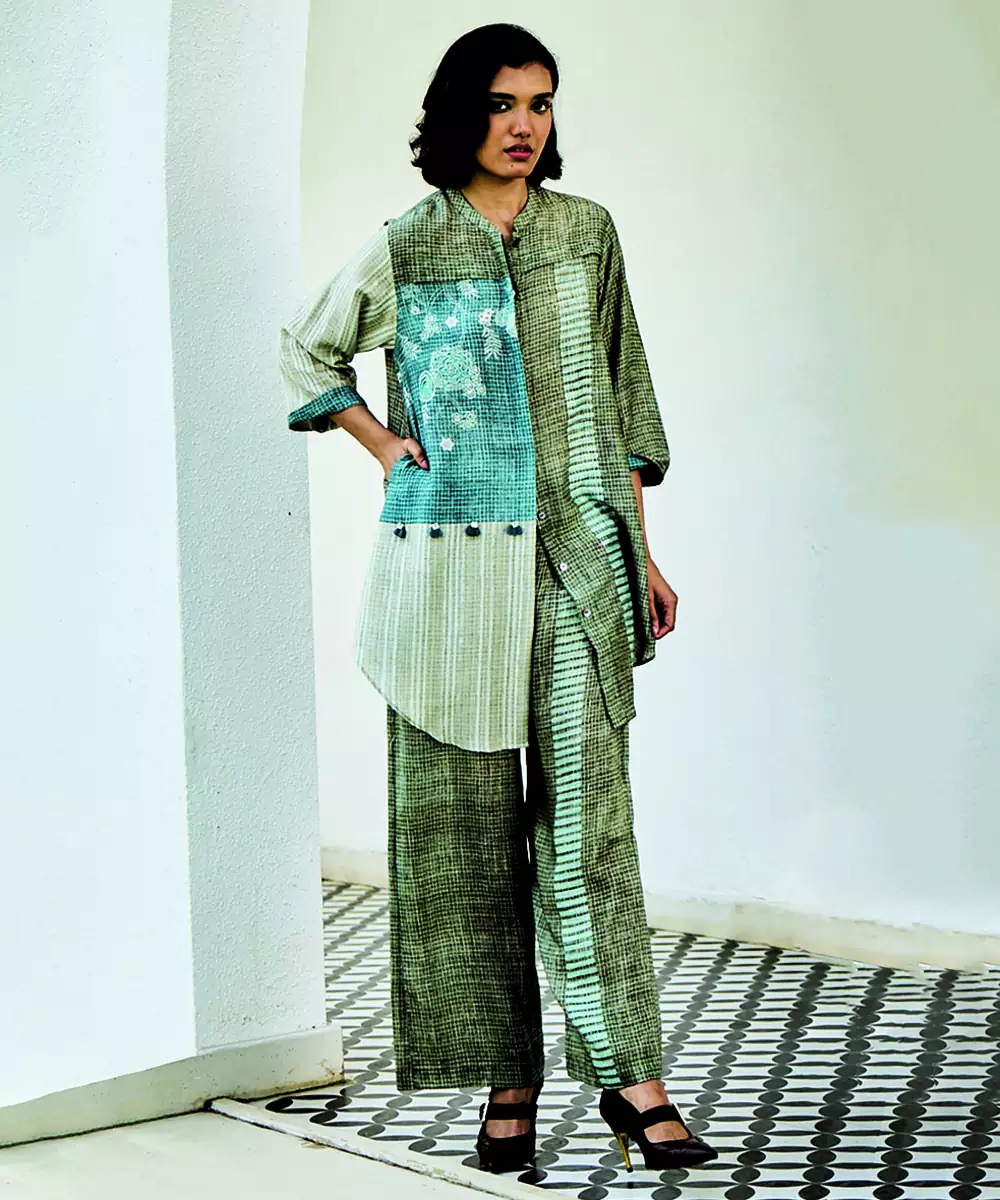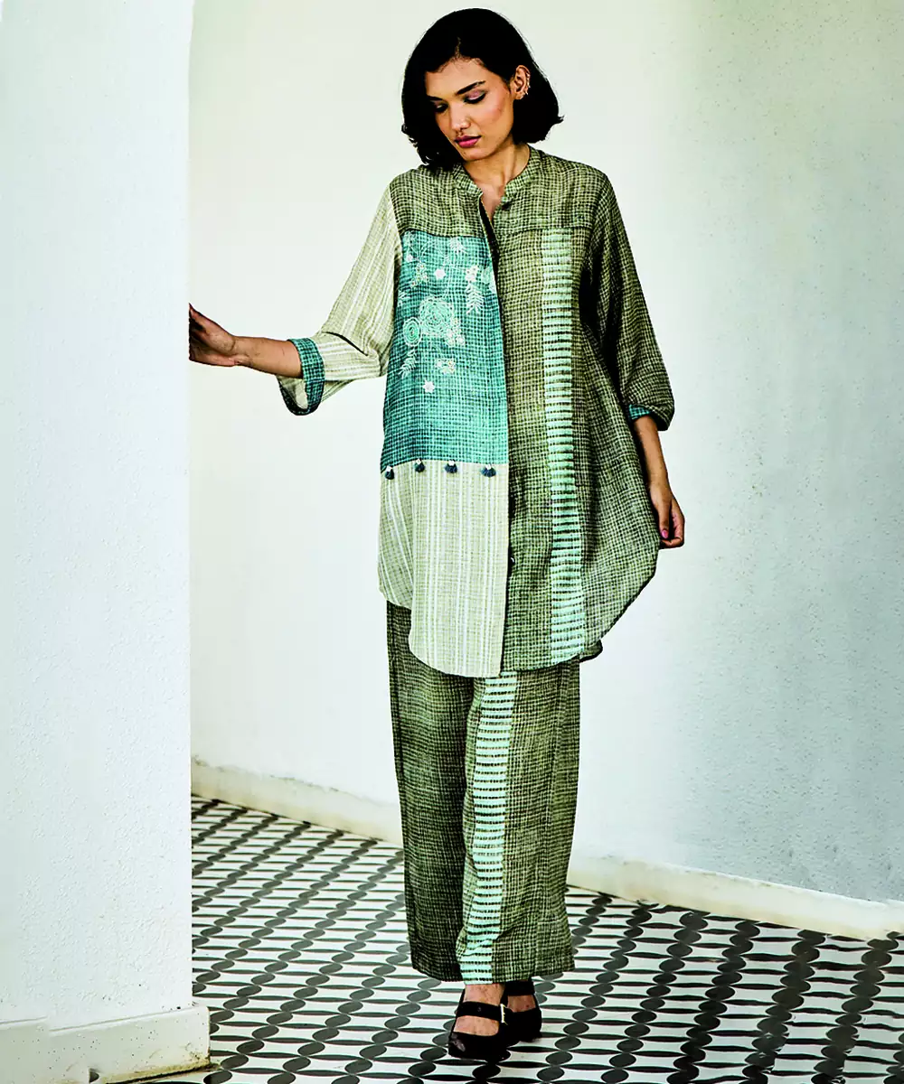 Grey Blue Printed Linen Kurta Set