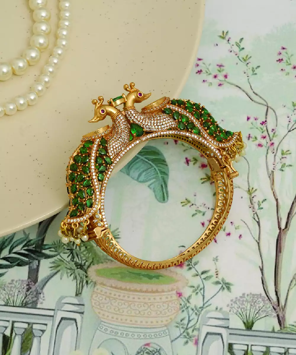 This Gold Plated Heritage Kada Features Rich Green Stones Set In An Intricate Traditional Design. The Elegant Detailing Enhances Its Regal Appeal, Making It Perfect For Festive Wear. A Timeless Accessory That Complements Ethnic Outfits Beautifully, Adding Sophistication And A Touch Of Classic Charm To Your Look.