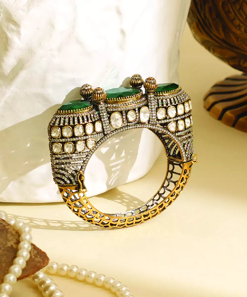 This Zircon Green Stone Royal Kada Showcases A Luxurious Design With Finely Studded Stones That Reflect Brilliance. Crafted For Elegance, It Adds A Regal Touch To Your Look. Perfect For Festive And Special Occasions, Its Bold Yet Refined Style Enhances Both Traditional And Contemporary Outfits Effortlessly.