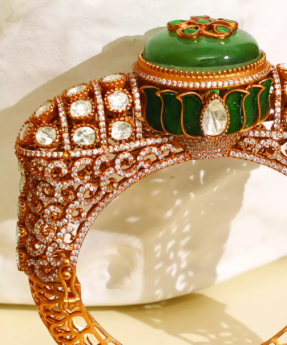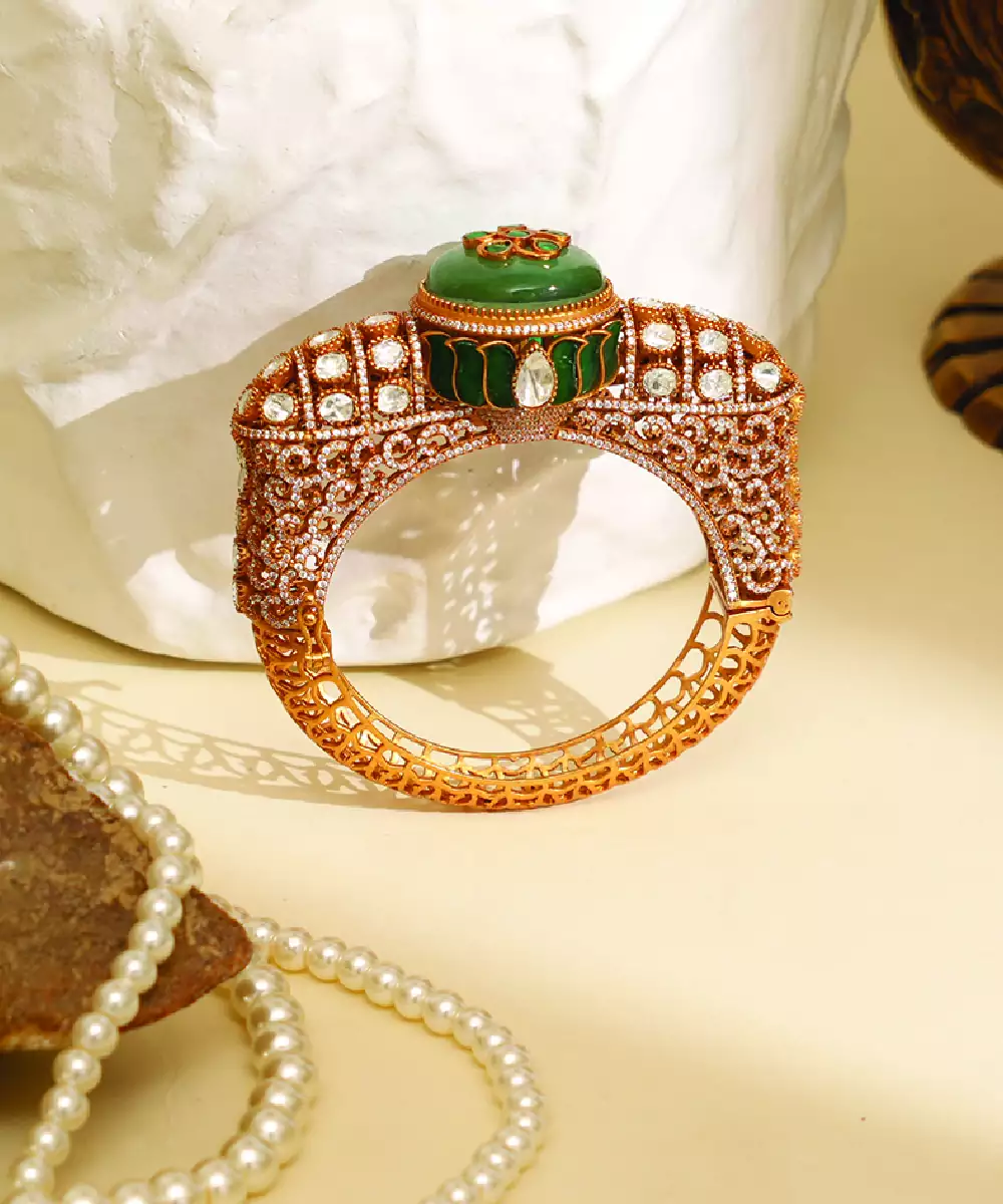 This Zircon Green Stone Royal Kada Is Designed To Offer Timeless Elegance With Its Intricate Detailing And Radiant Stones. The Vibrant Hue Adds Freshness, Making It Suitable For Festive Occasions. A Stylish Accessory That Enhances Your Ensemble With Grace And A Touch Of Luxury.