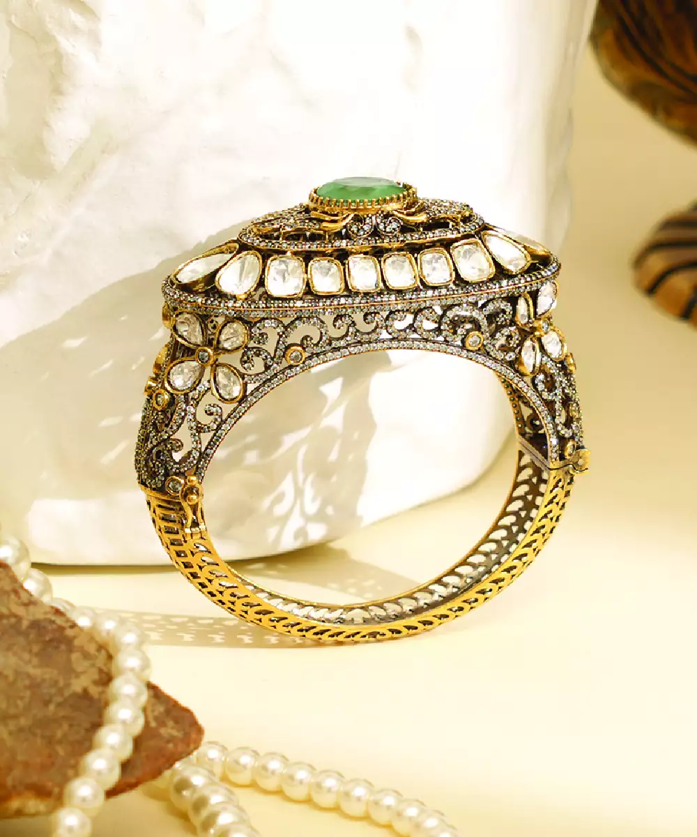This Zircon Mint Green Stone Royal Kada Offers A Refreshing And Elegant Design. The Soft Green Tones Add A Subtle Charm, While The Sparkling Stones Enhance Its Luxurious Appeal. Perfect For Festive And Casual Occasions, It Brings A Graceful And Modern Touch To Your Jewelry Collection.