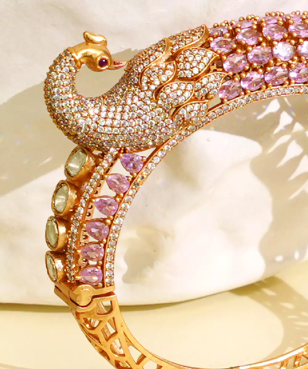This Zircon Pink Stone Royal Kada Showcases A Soft Yet Vibrant Appeal With Its Beautifully Studded Stones. The Elegant Design Adds A Feminine Touch, Making It Perfect For Festive And Special Occasions. A Graceful Accessory That Enhances Your Look With Charm And Sophistication.