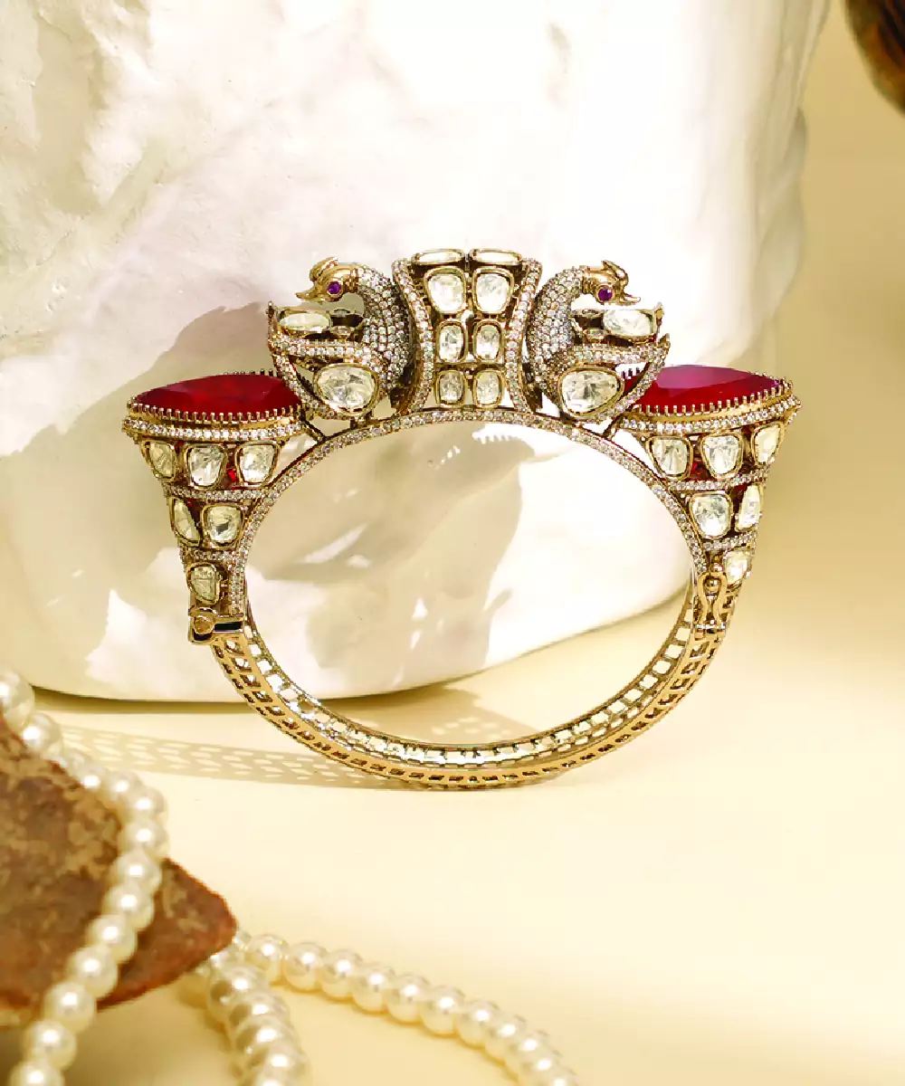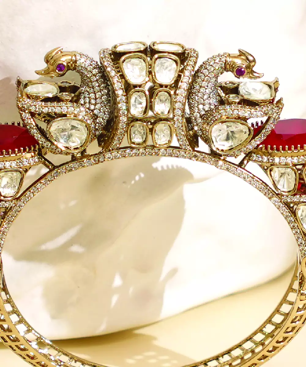Featuring Vibrant Red Stones, This Zircon Royal Kada Adds A Bold And Elegant Touch To Your Look. The Intricate Craftsmanship Enhances Its Traditional Appeal, Making It Perfect For Festive Occasions. A Striking Accessory That Brings Richness And Sophistication To Your Ethnic Styling.
