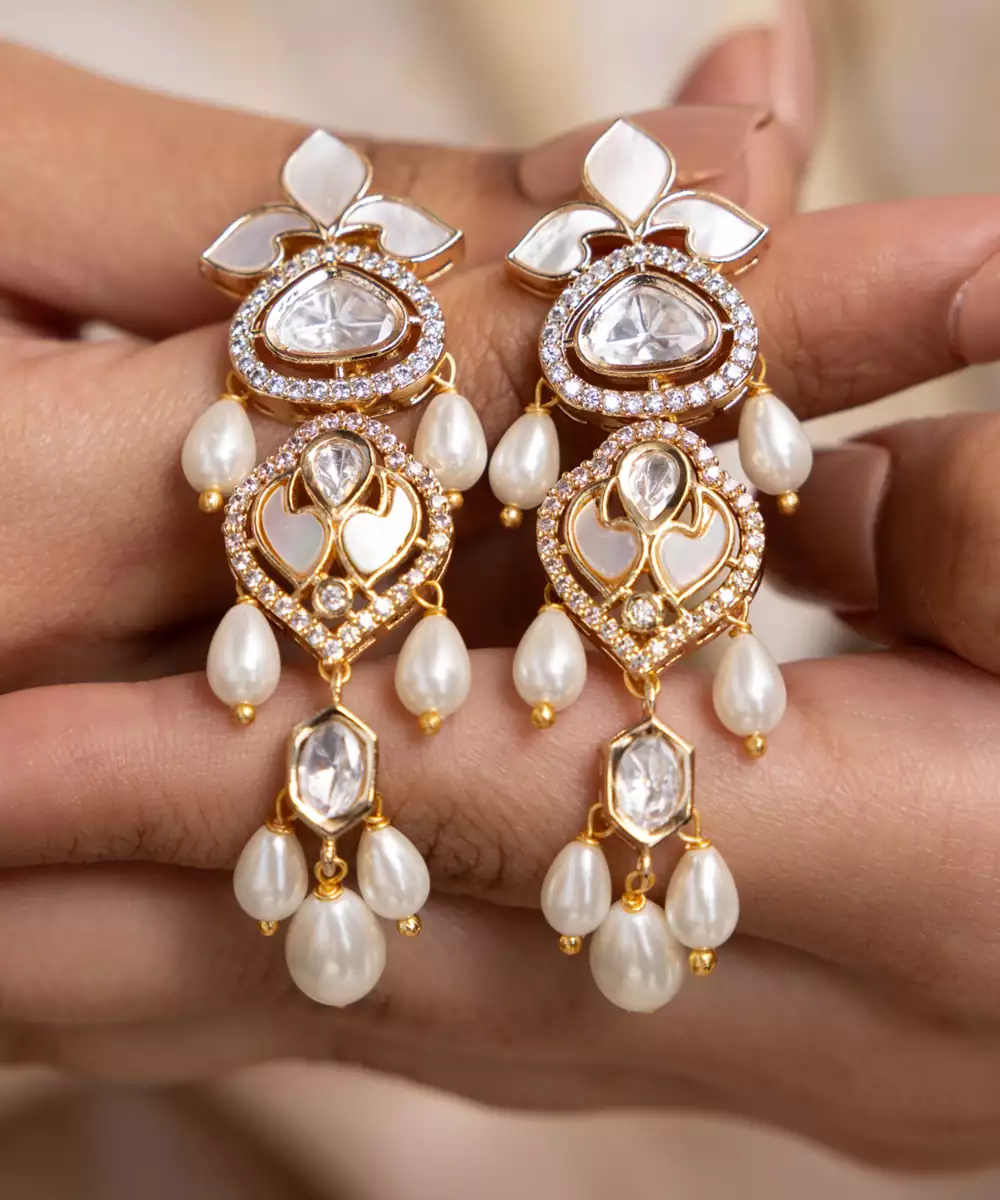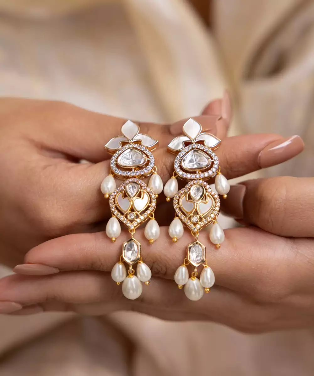 These Classic Gold Toned Earrings Are Adorned With Polki Stones And Tiered Pearl Hangings. A Timeless Choice For Weddings, Festive Gatherings, Or Heritage Styling.