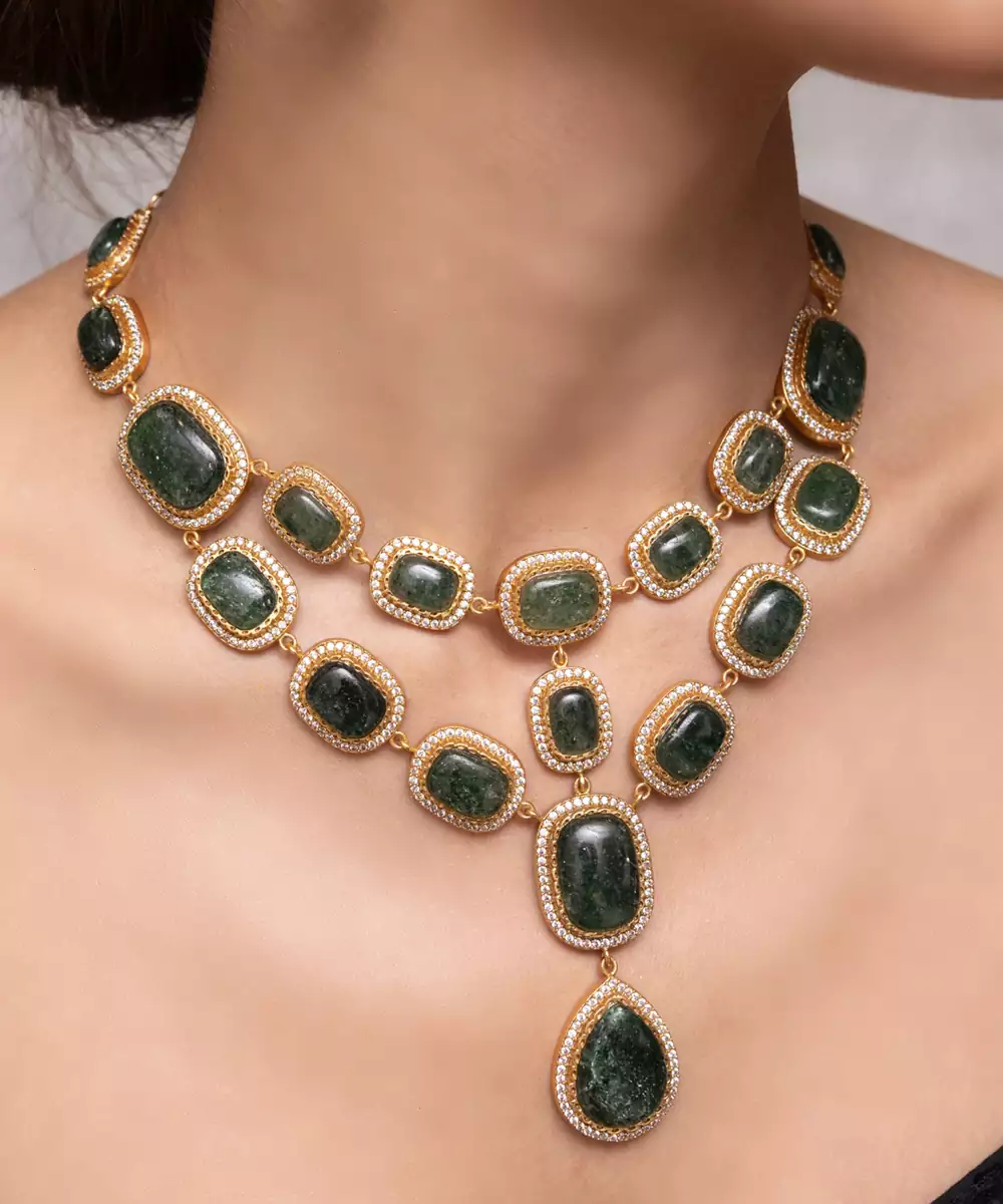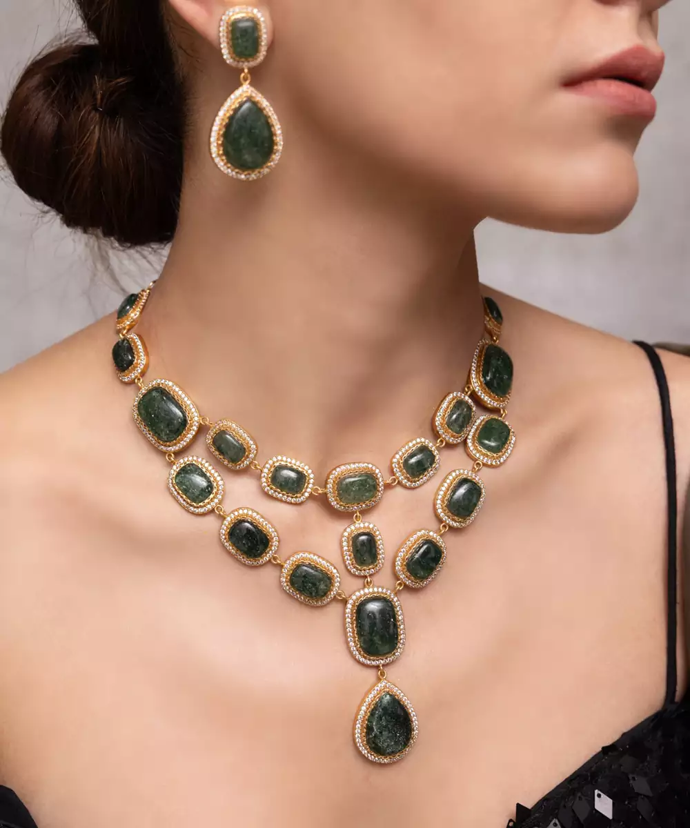 Symmetrical And Striking, This Emerald Toned Necklace Features Matching Earrings And Intricate Stone Settings That Celebrate Grandeur. A Flawless Pick For Bridal Portraits Or Gala Occasions.