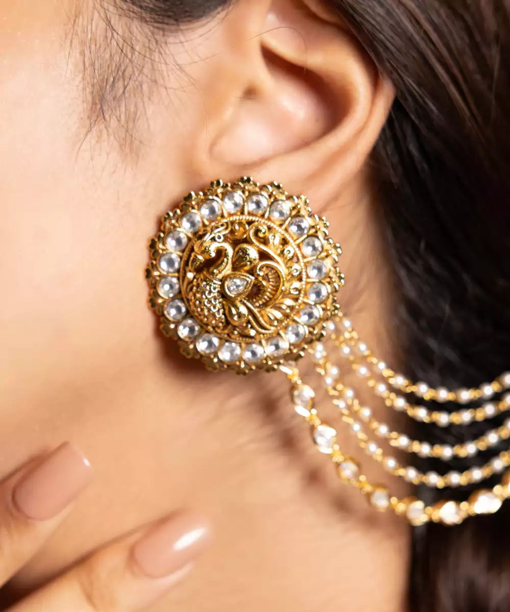 A Bold Ear Cuff Style Earring With A Central Peacock Motif And Strings Of Gold Beads Cascading Along The Ear Curve. Dramatic And Unique, Perfect For Fusion Outfits Or Standout Ceremonial Wear.