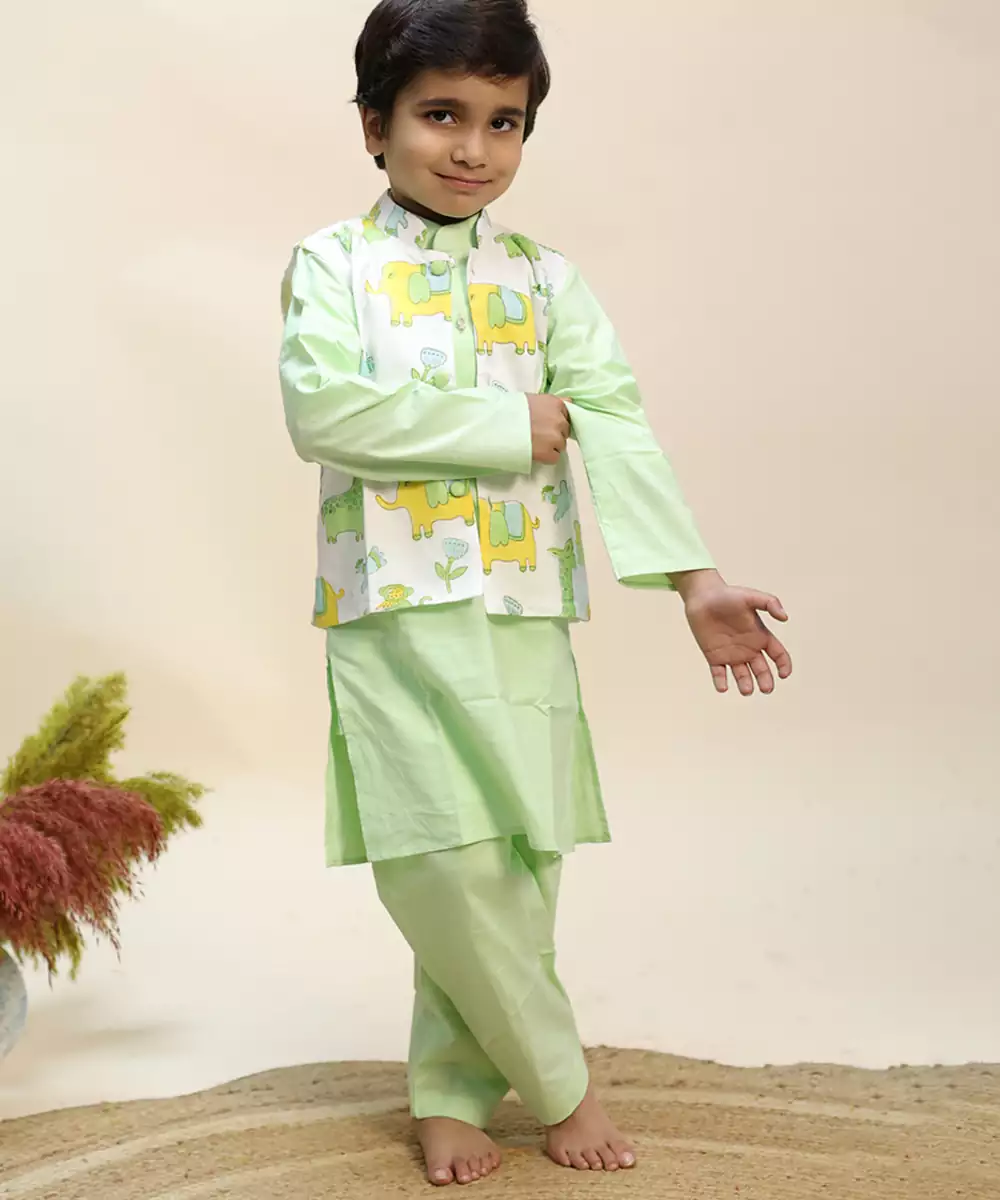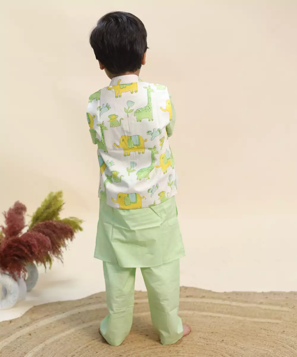 A Vibrant Green Kurta Jacket Set Highlighted With Traditional Prints For A Distinctive Ethnic Look. The Lightweight Cotton Fabric Provides Airy Comfort, While The Jacket Enhances Structure. Perfect For Cultural Events And Daytime Festivities, This Ensemble Offers A Balance Of Style And Ease.