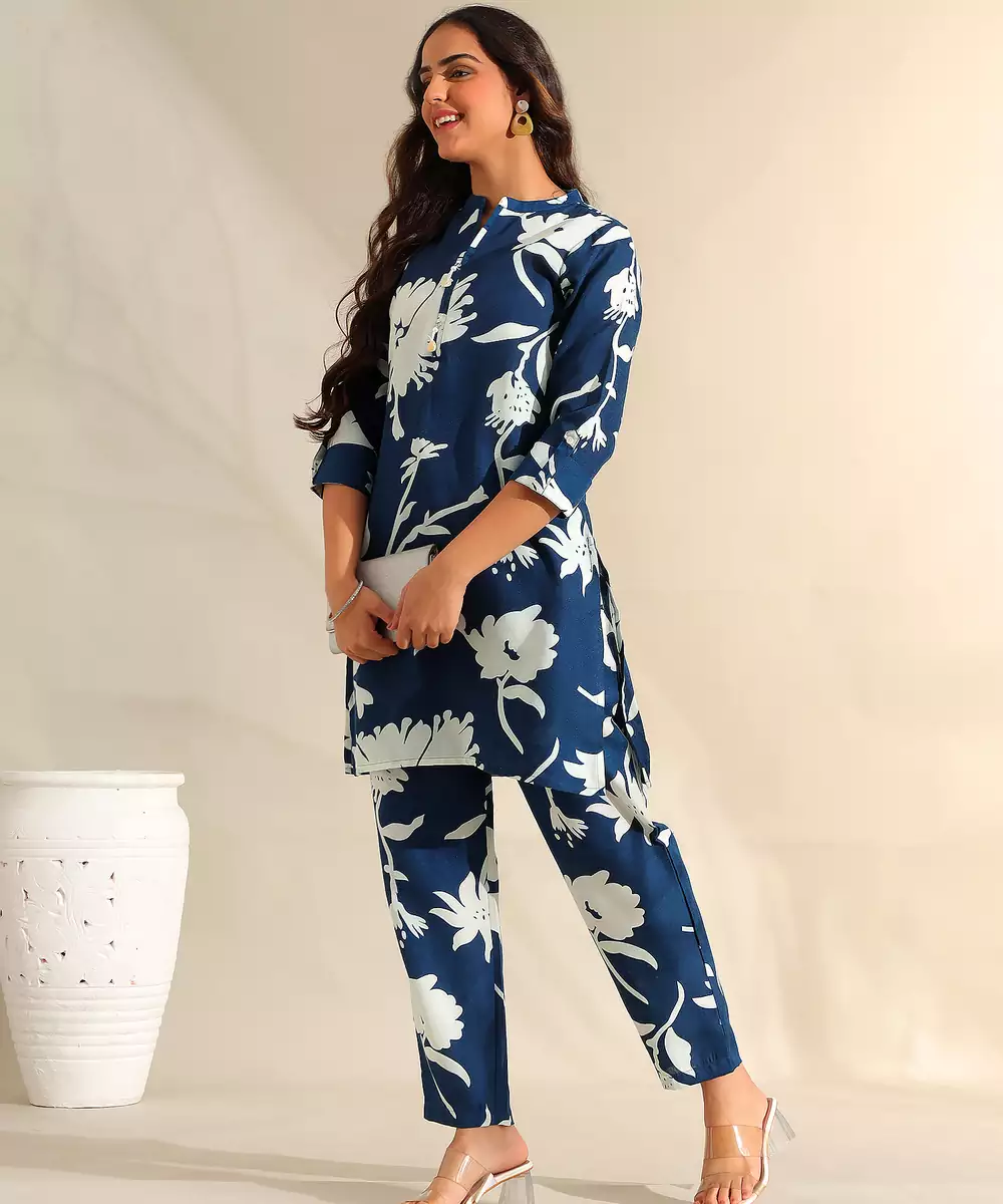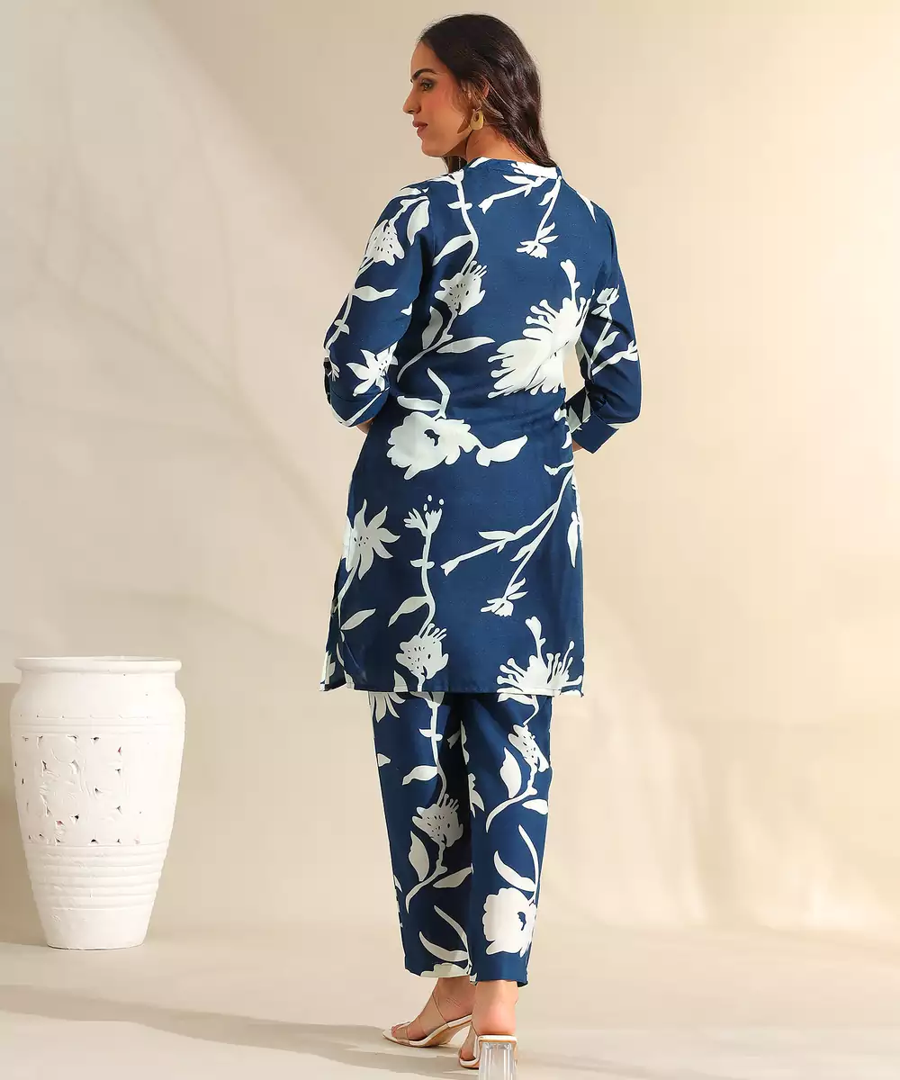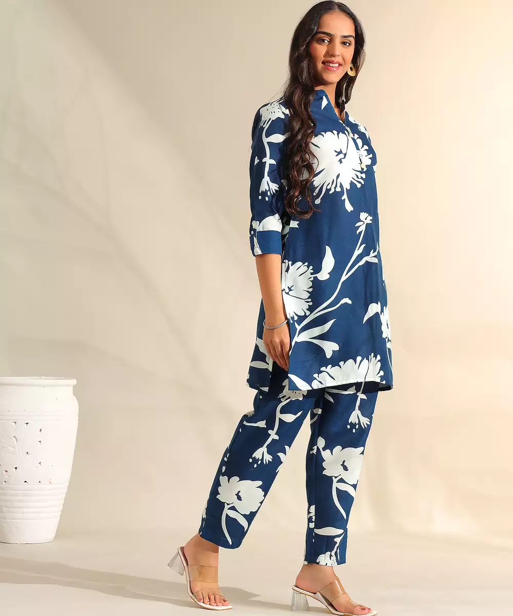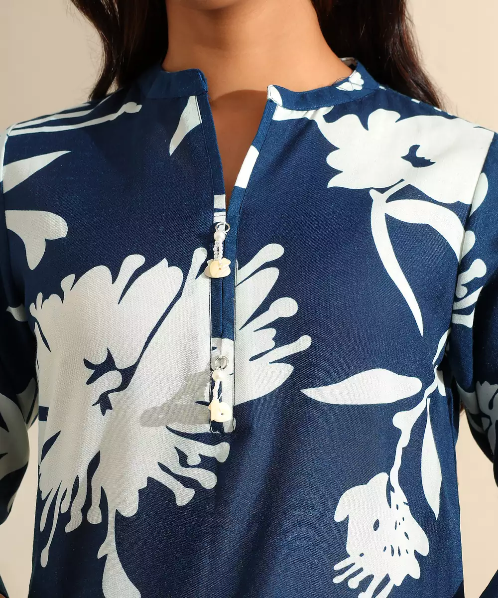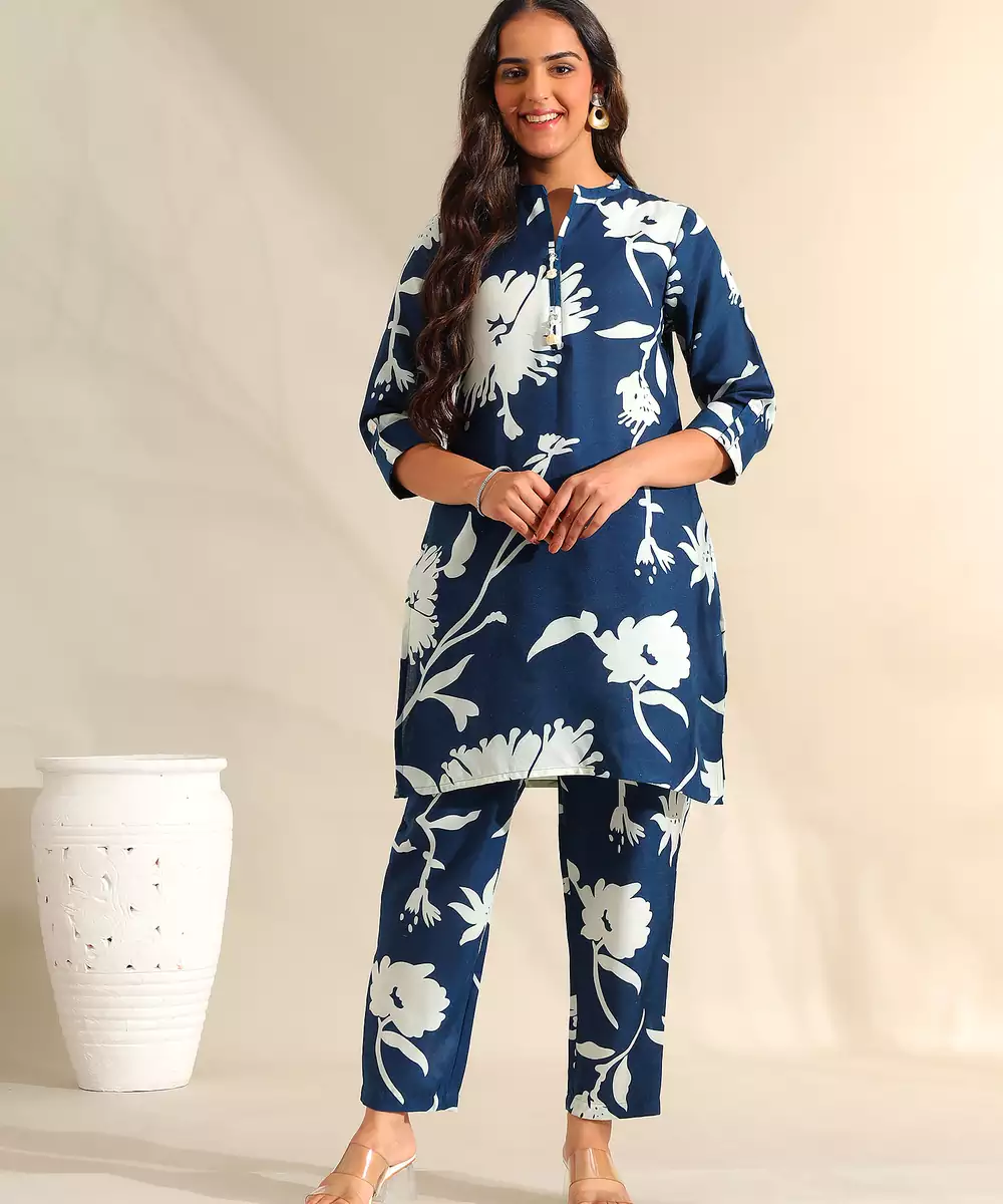 Define Your Contemporary Ethnic Style With The Inaayat Set, Featuring A High Contrast Navy And Ivory Large Scale Floral Usp. This Sophisticated Ensemble Is Rendered In A Deep Navy Blue And Decorated With Artistic, Oversized White Floral Blooms That Flow Across Both The Top And Bottom. The Kurta Features A Modern Notched Mandarin Collar With A Delicate Tassel And Button Accent, Paired With A Contemporary Straight Cut Hem. It Is Completed With Matching Printed Trousers, Offering A Bold, Cohesive, And Effortlessly Chic Silhouette Perfect For Social Gatherings.