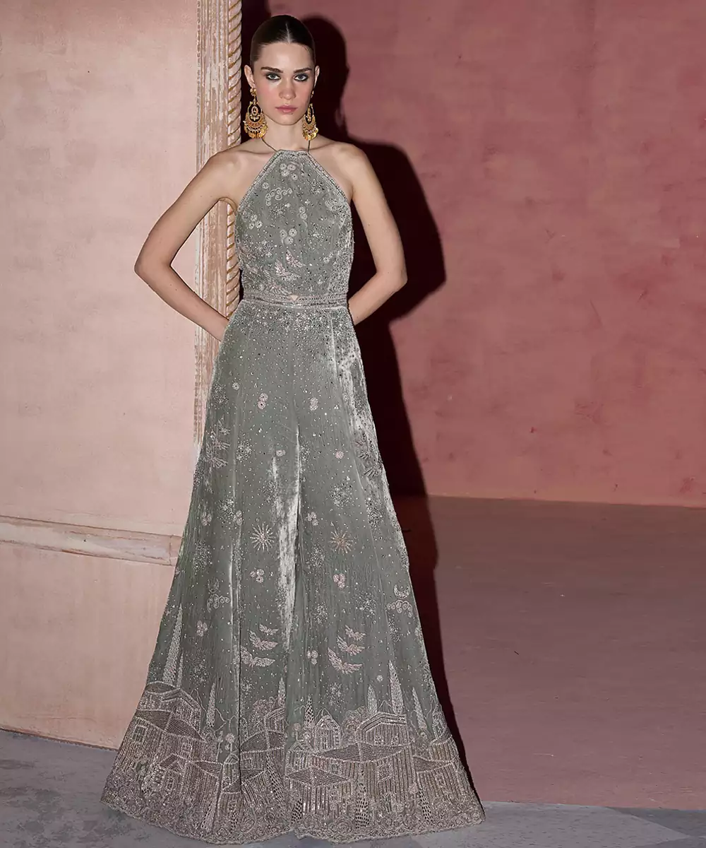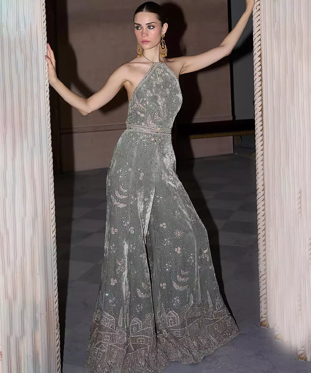 This Pista Green Embroidered Velvet Silk Jumpsuit Features A Soft, Luxurious Texture With Intricate Detailing. The Tailored Silhouette Offers A Modern Twist, Making It Perfect For Festive And Party Wear. A Stylish Outfit That Blends Comfort With Elegance Effortlessly.