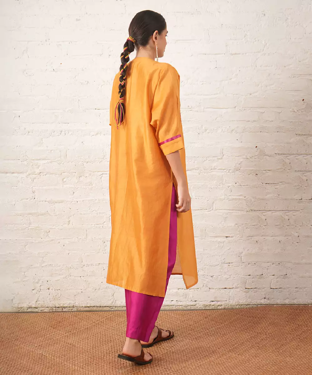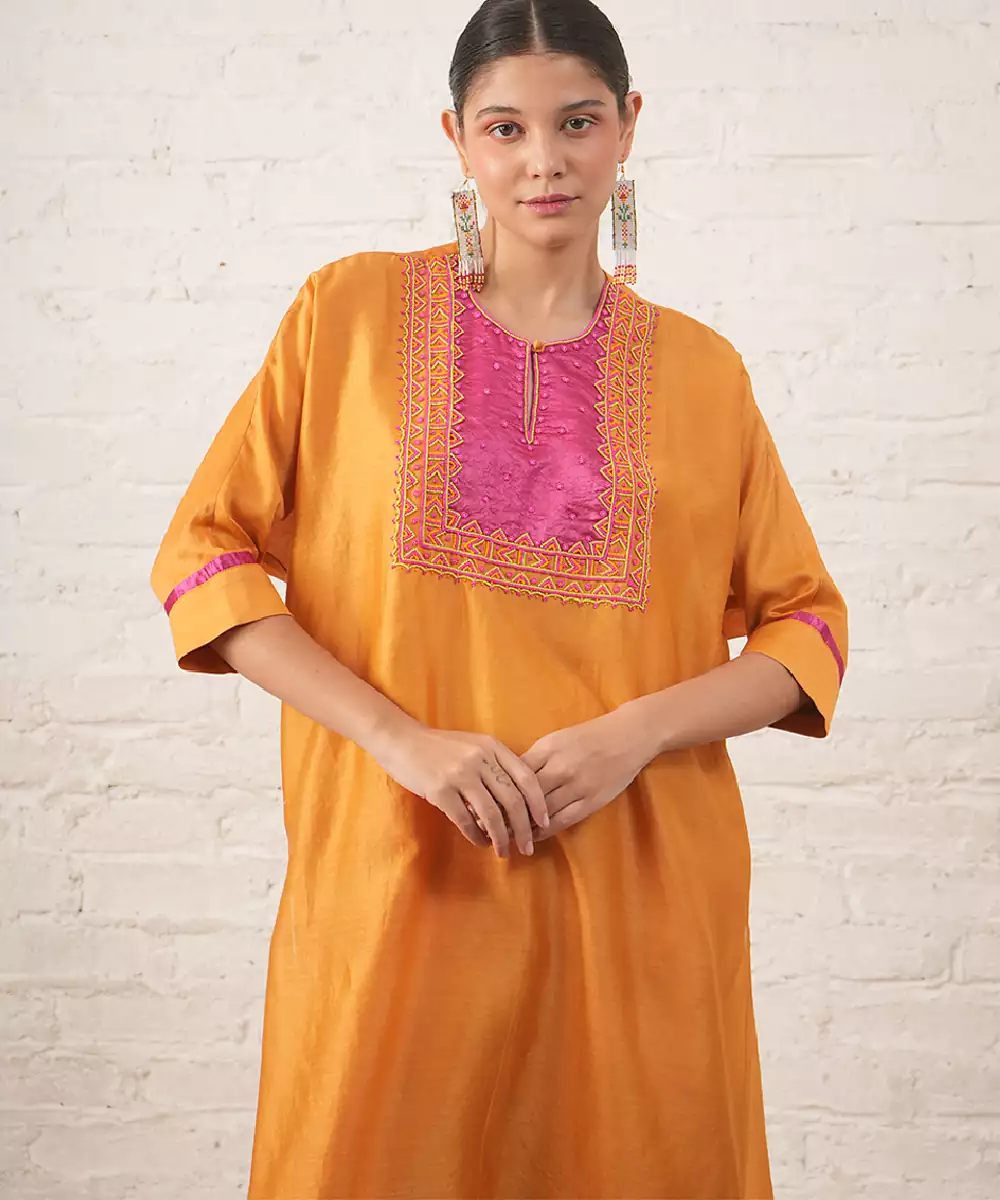 This Mustard Yellow Chanderi Kurta Set Showcases Intricate Embroidery That Adds Richness And Charm. The Lightweight Fabric Offers Comfort And A Soft Sheen, While The Silhouette Enhances Elegance. Ideal For Festive Occasions, It Pairs Effortlessly With Minimal Accessories For A Timeless Look.