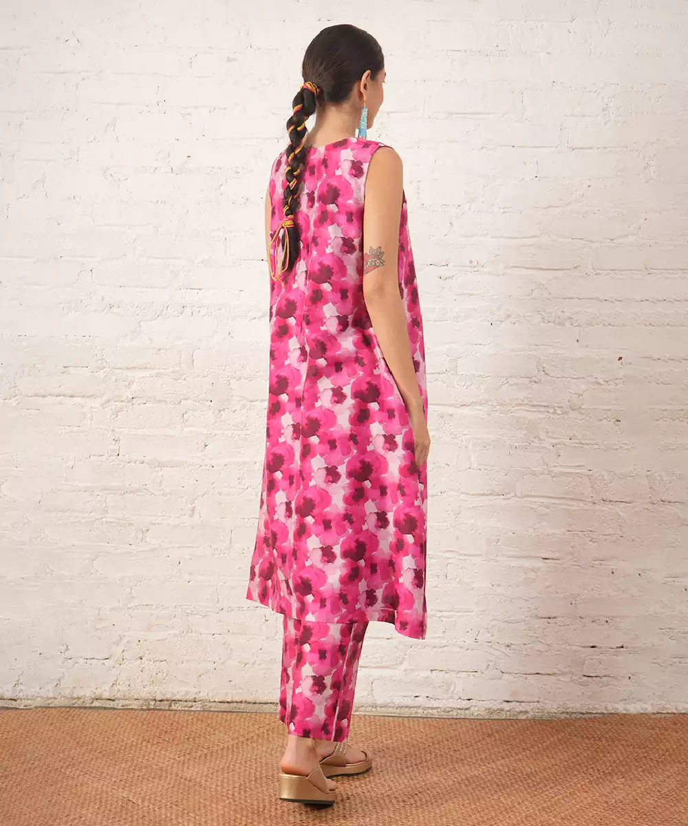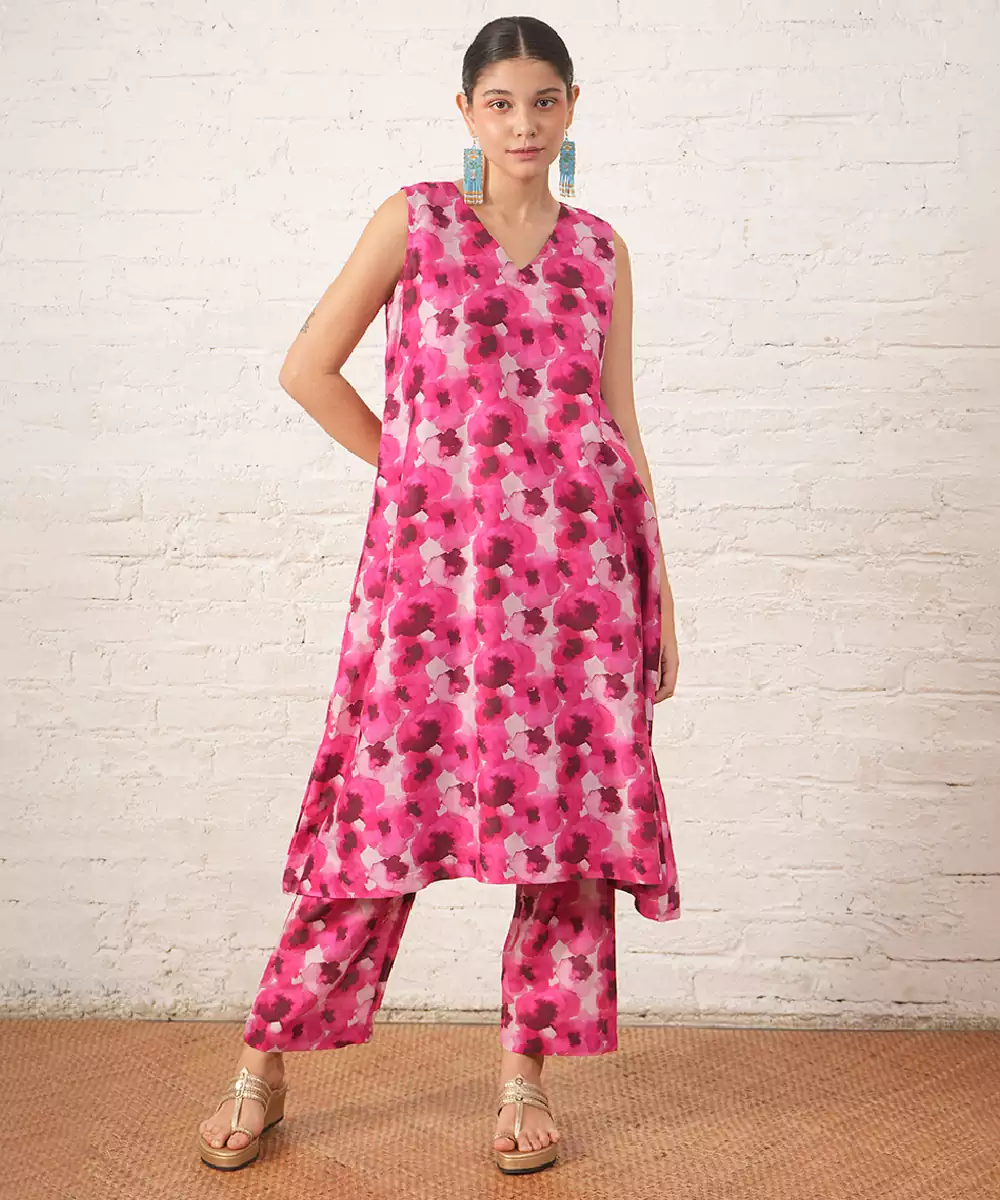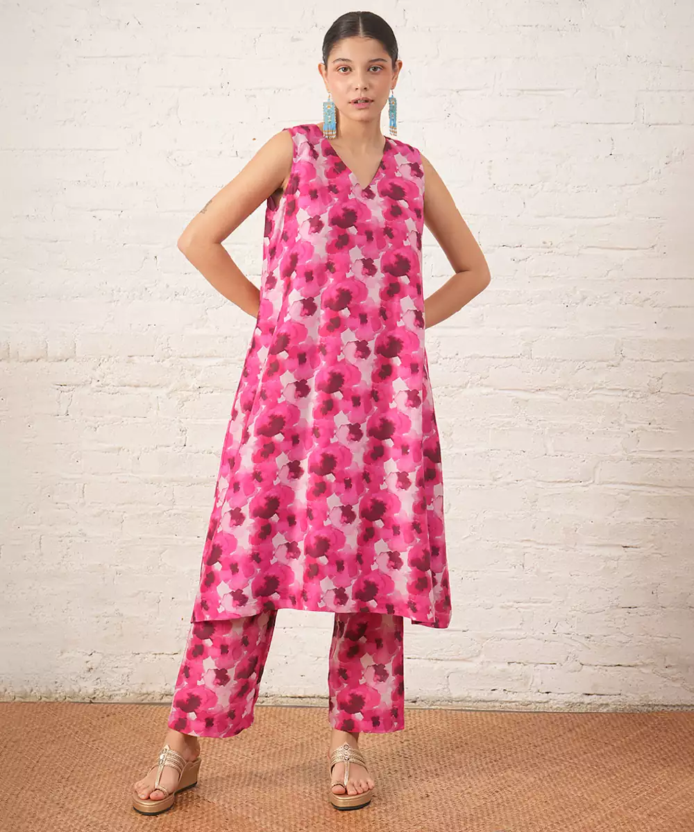 This Pink Chanderi Kurta Set Features Delicate Floral Prints That Add A Feminine And Graceful Touch. The Lightweight Fabric Ensures Comfort And Elegance. Perfect For Daytime Events Or Festive Occasions, It Pairs Beautifully With Minimal Accessories For A Charming And Stylish Look.