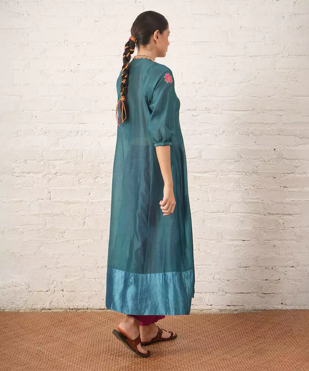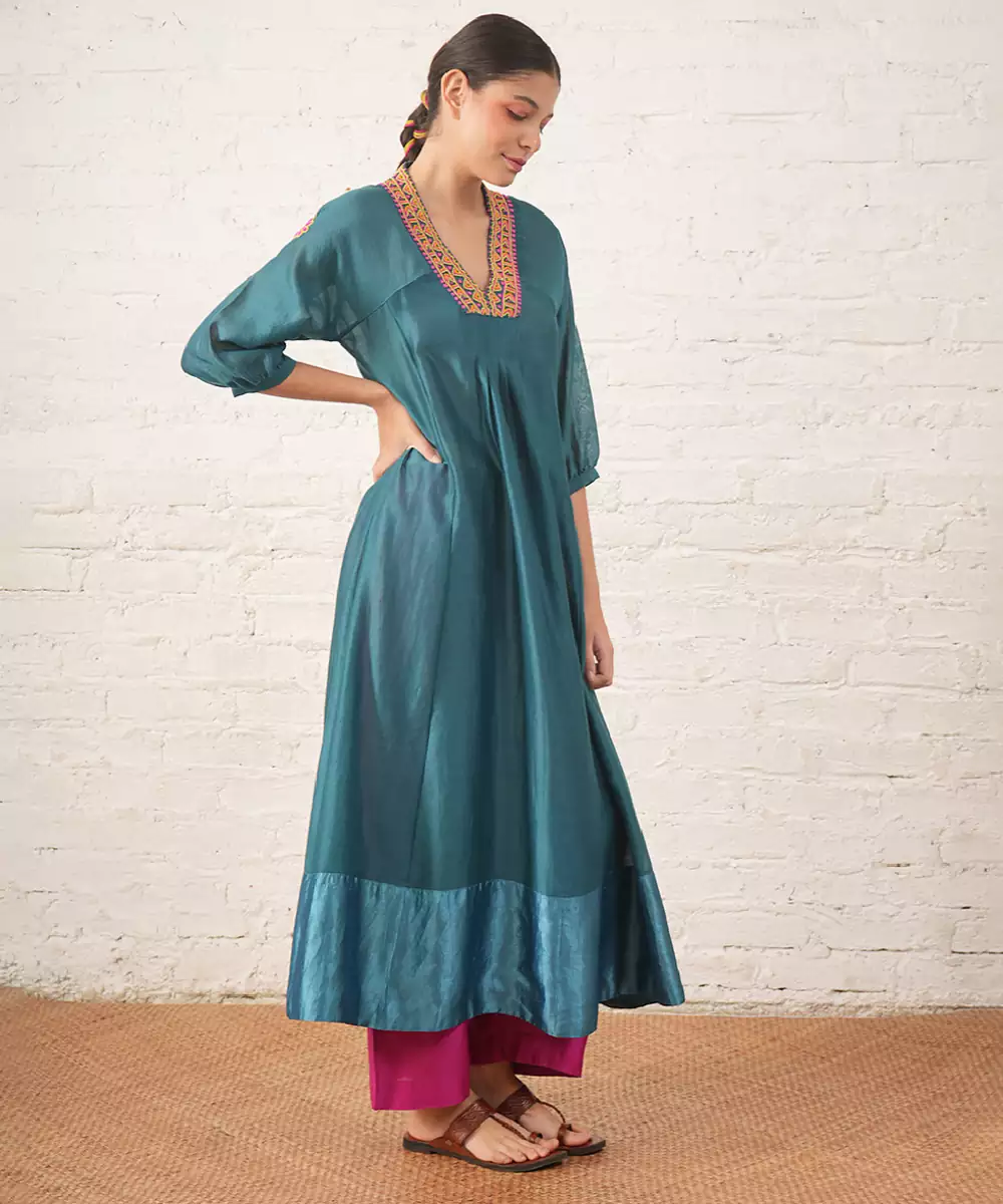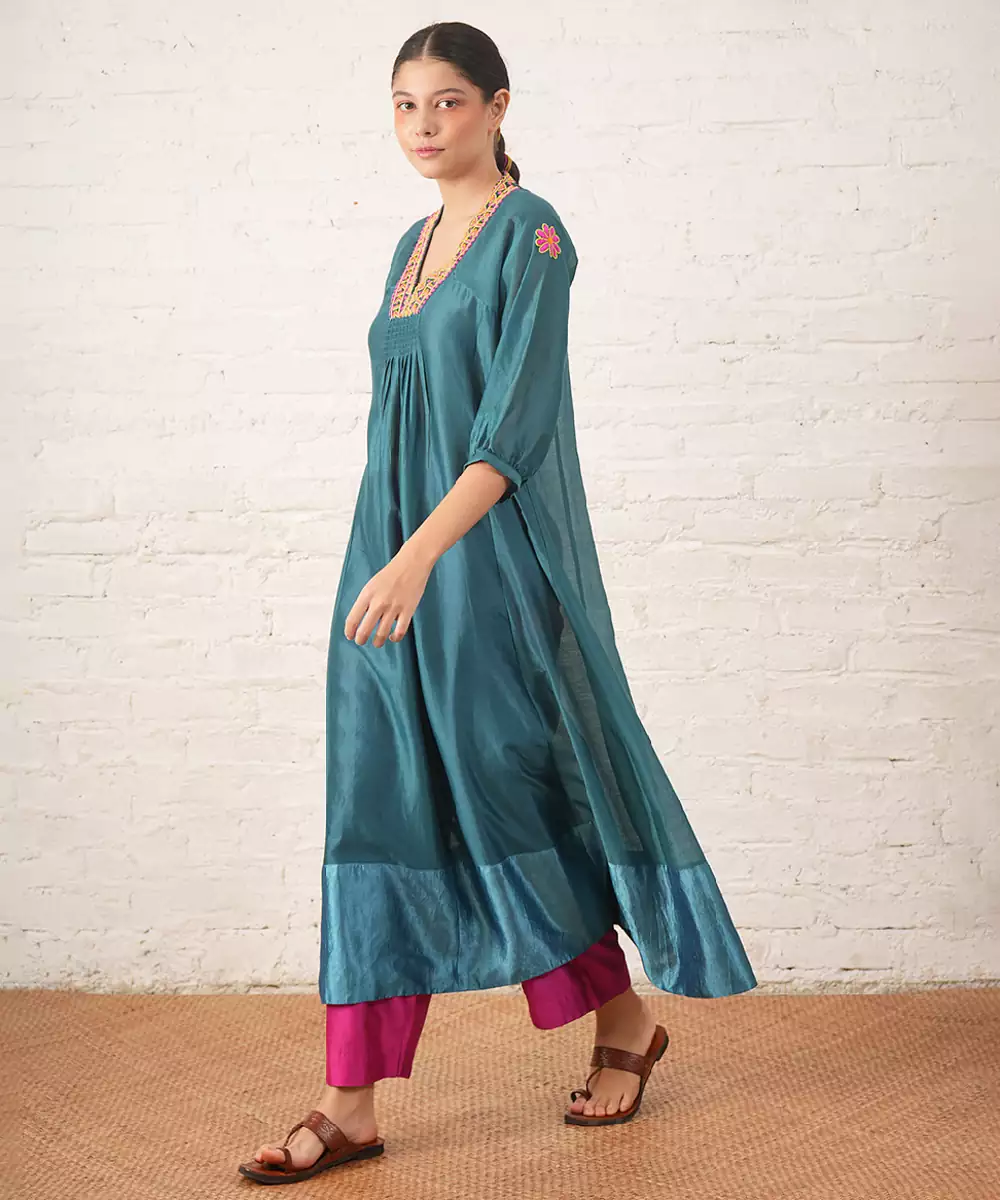 This Teal Blue Chanderi Kurta Set Features Fine Embroidery That Enhances Its Sophisticated Appeal. The Lightweight Fabric Drapes Gracefully, Ensuring Comfort And Style. Perfect For Festive Occasions Or Gatherings, It Pairs Beautifully With Subtle Accessories For A Refined Look.