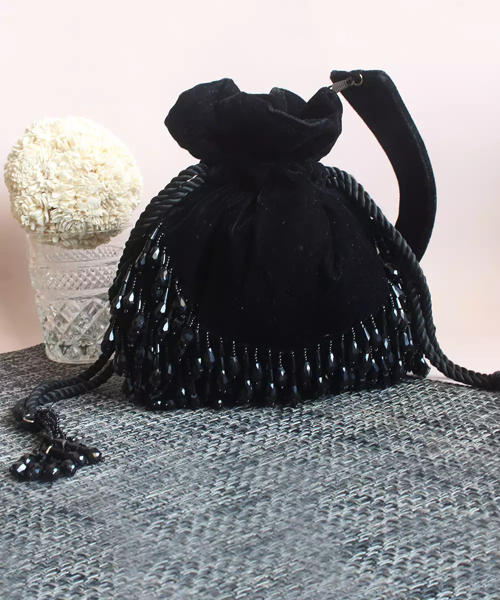 A Black Velvet Potli Embedded With Black Pearl Drops To Complete That Evening Outfit.