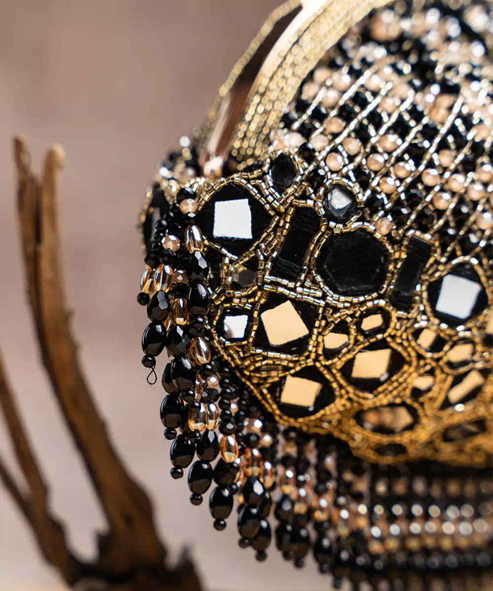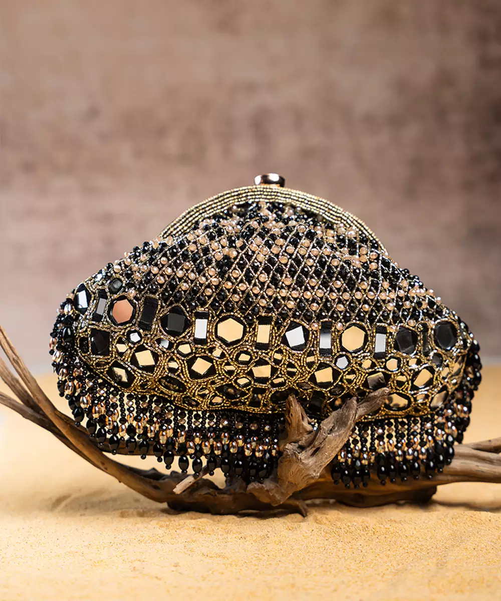 A Stunning Blend Of Tradition And Elegance. This Clutch Is Adorned With Sparkling Mirrors, Pearls And Intricate Bead Work, All In A Sophisticated Black Hue. The Mirror Finishing Adds A Luxurious Touch, While The Beadwork Brings A Playful Yet Elegant Flair. Perfect For Special Occasions, This Potli Is Designed To Catch The Light And Elevate Your Ensemble.