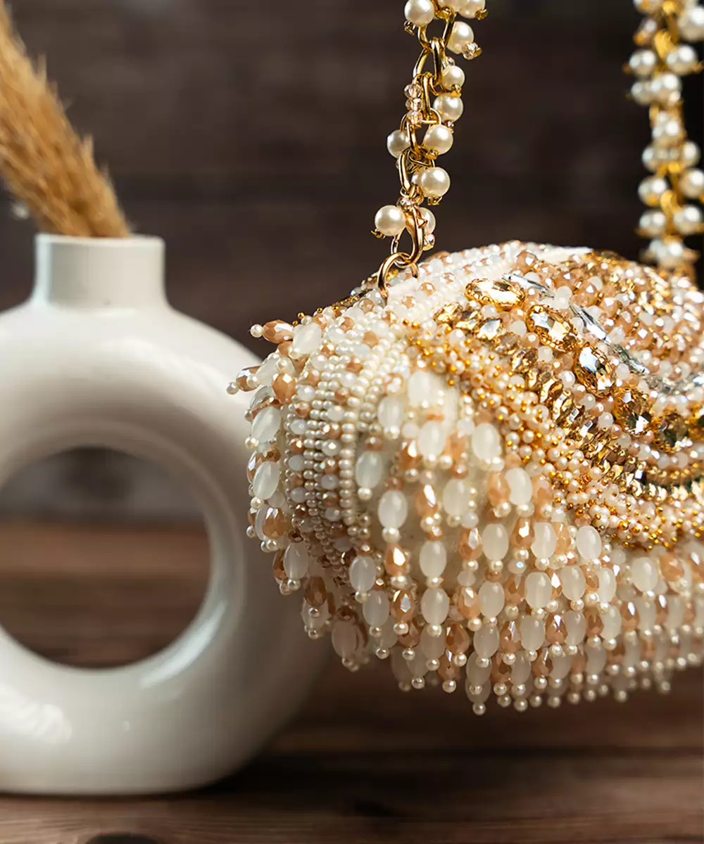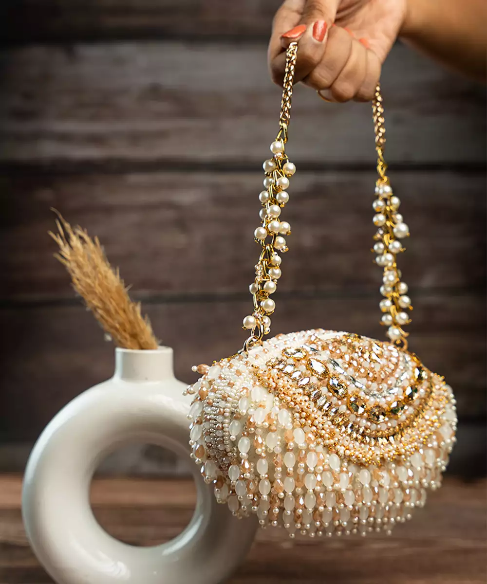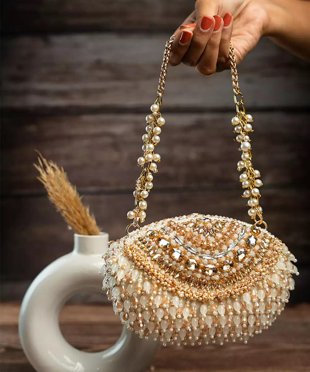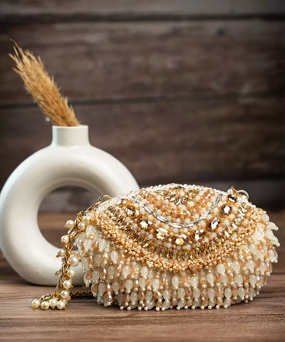 It Doesn't Get More Modish Than This Gold And Off White Beadwork Clutch Accompanied With Beaded Tassels Throughout Making It An "Oh La La" Addition To Any Contemporary Fit.