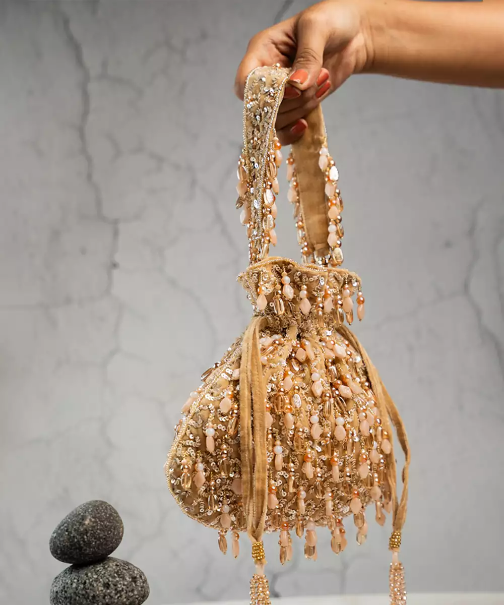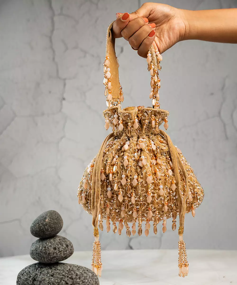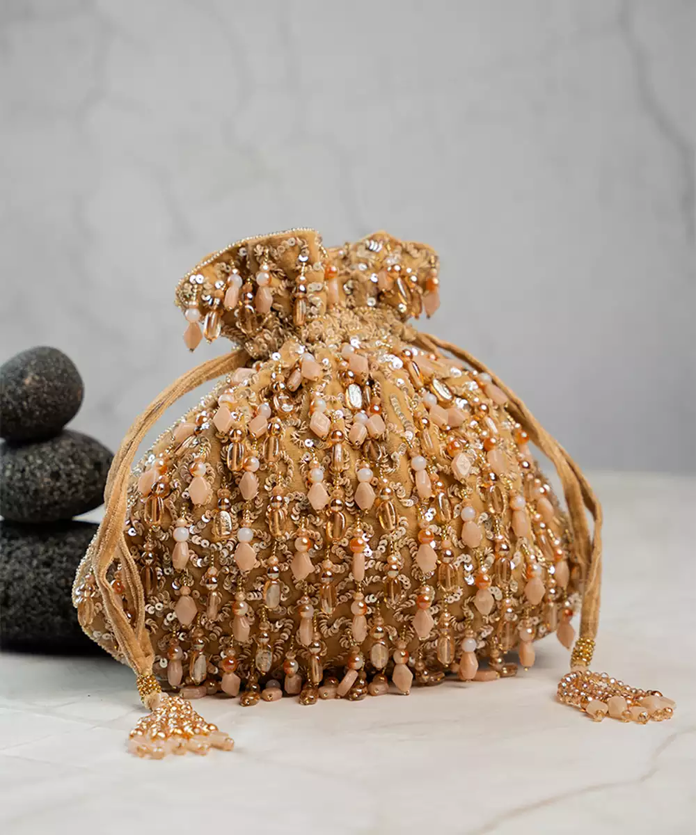 This Tasseled Potli Is A Stunning Blend Of Elegance And Craftsmanship, Featuring Lustrous Beads And Intricate Work In A Cream And Gold Palette. Finished With Delicate Tassels, It’s The Perfect Accessory For Weddings, Festive Events, Or Evening Soirées.
