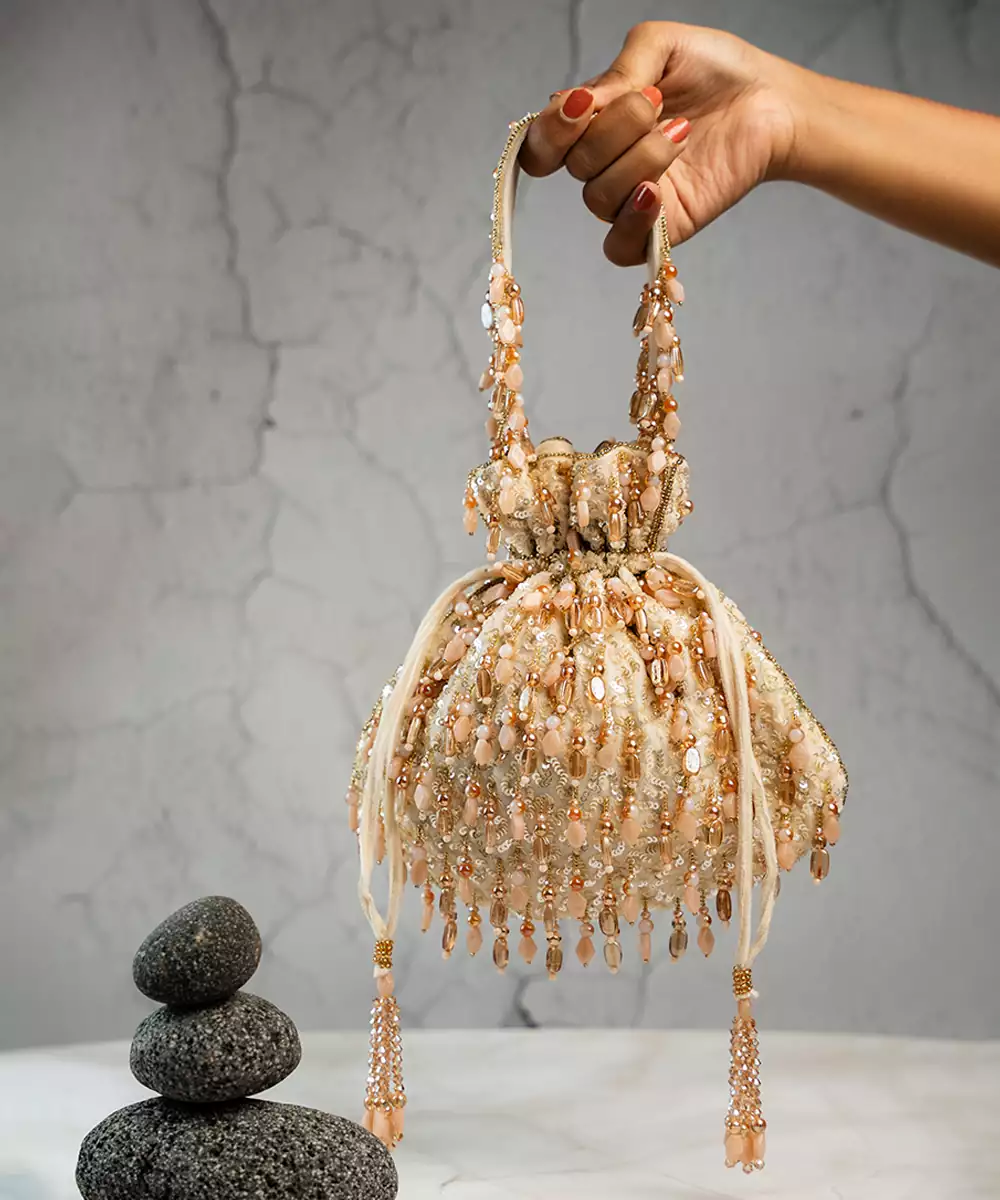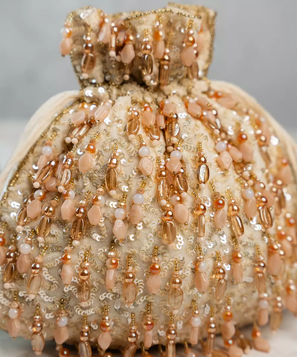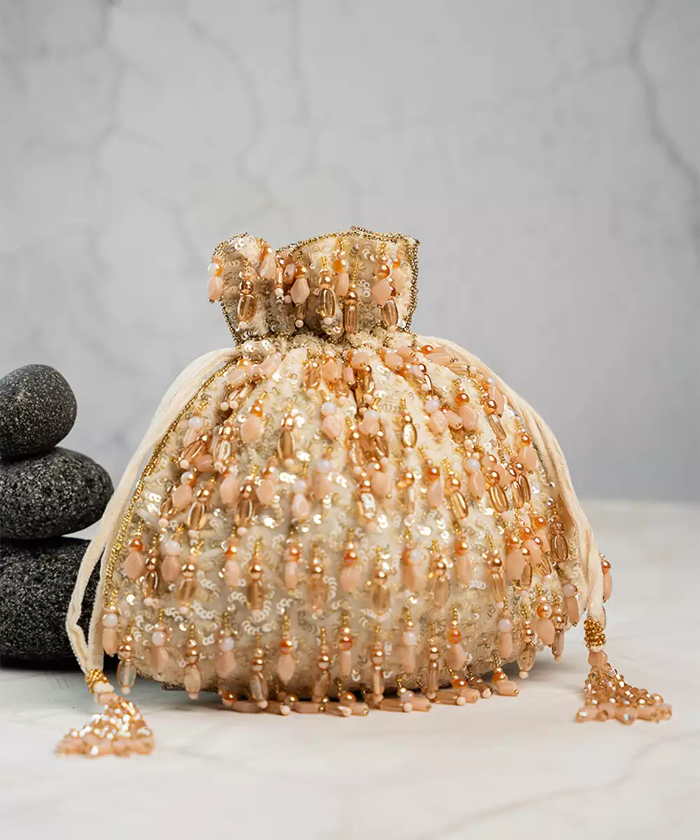 This Tasseled Potli Is A Stunning Blend Of Elegance And Craftsmanship, Featuring Lustrous Beads And Intricate Work In A Cream Palette. Finished With Delicate Tassels, It’s The Perfect Accessory For Weddings, Festive Events, Or Evening Soirées.