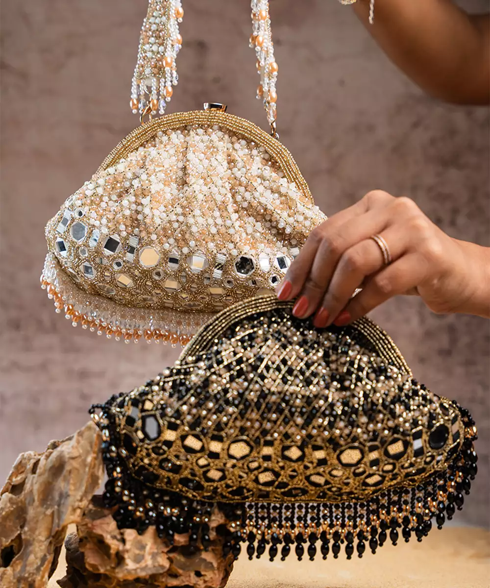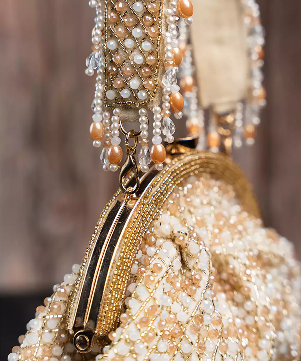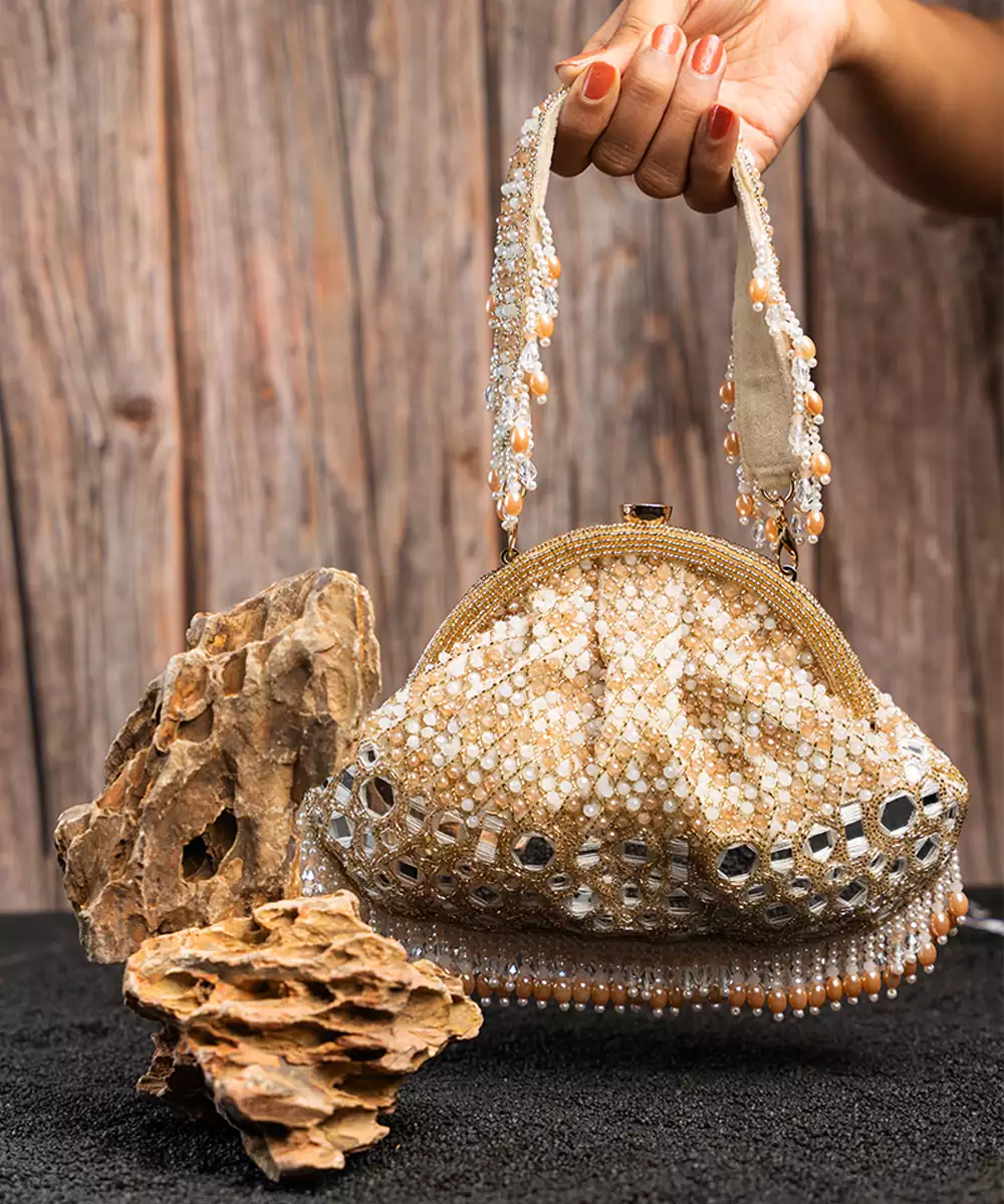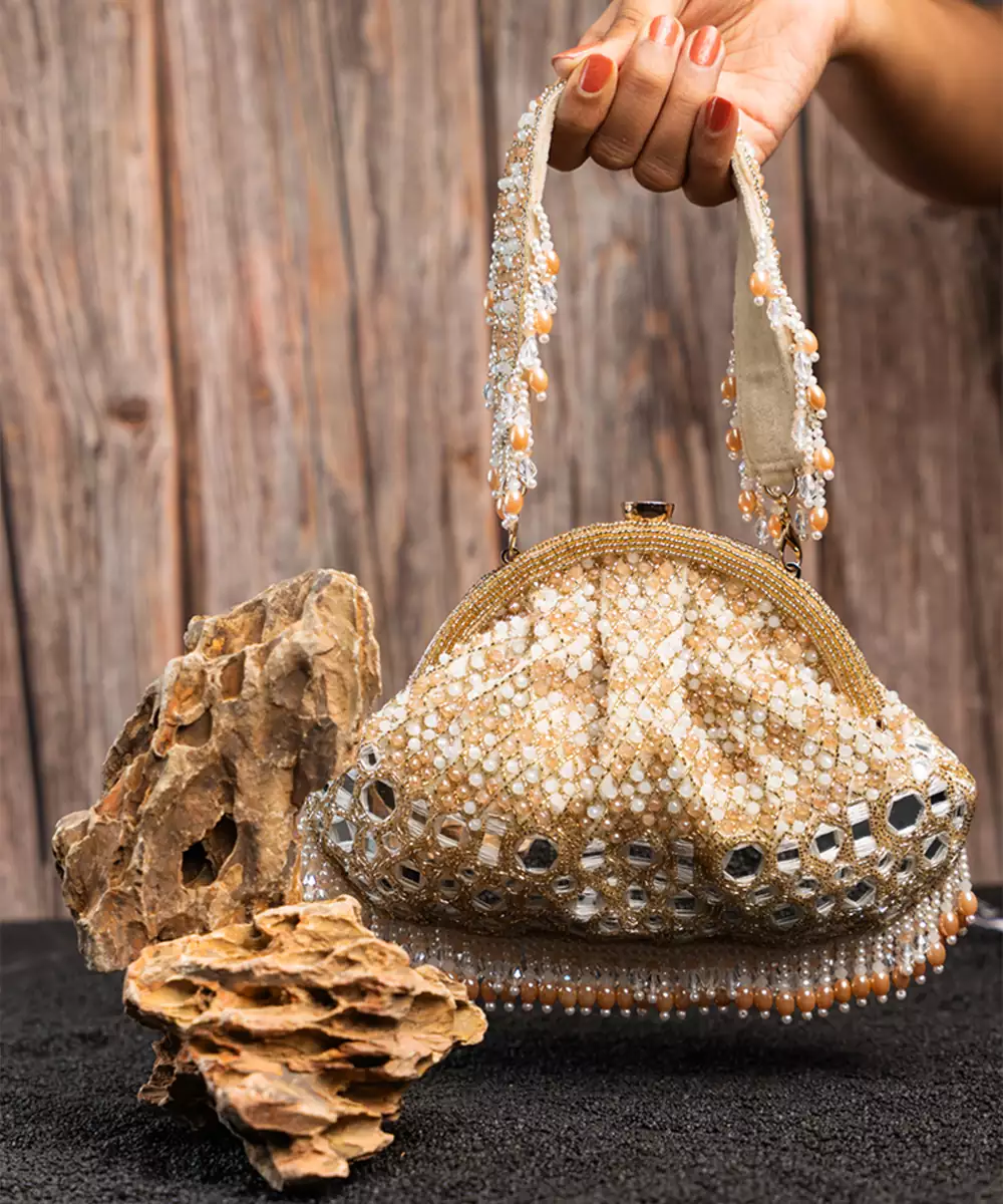 A Stunning Blend Of Tradition And Elegance. This Clutch Is Adorned With Sparkling Mirrors, Pearls And Intricate Bead Work, All In A Sophisticated Gold Hue. The Mirror Finishing Adds A Luxurious Touch, While The Beadwork Brings A Playful Yet Elegant Flair. Perfect For Special Occasions, This Potli Is Designed To Catch The Light And Elevate Your Ensemble.