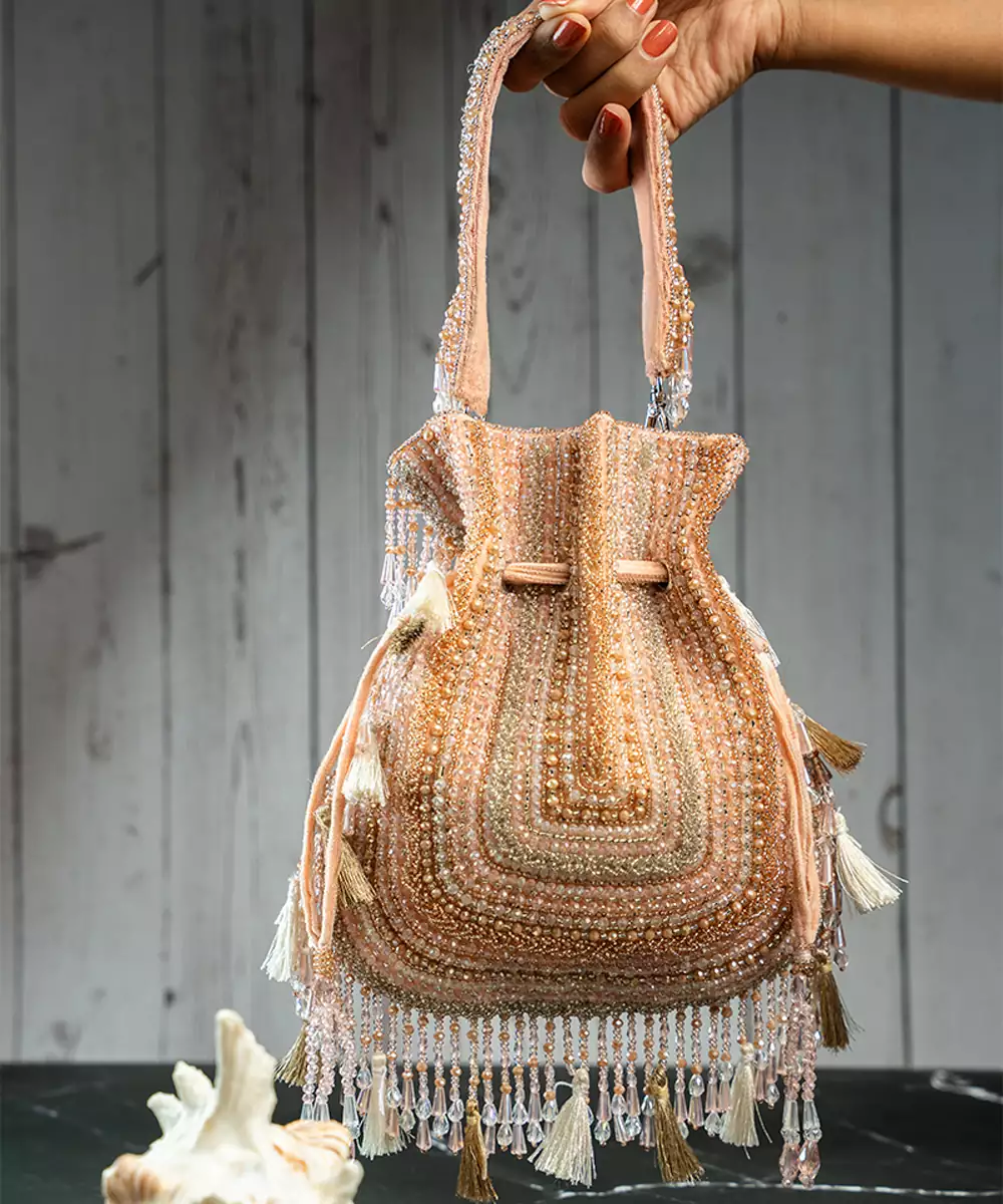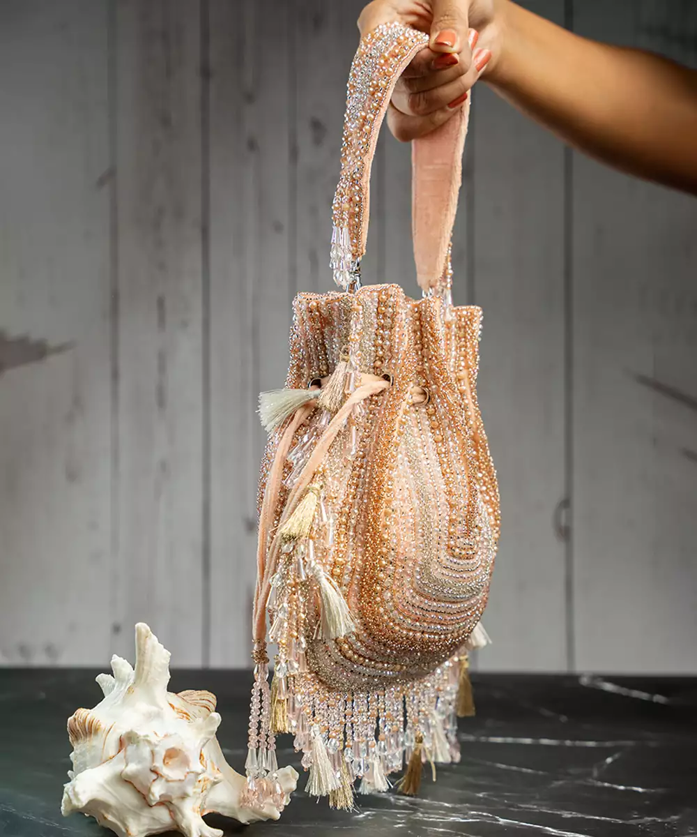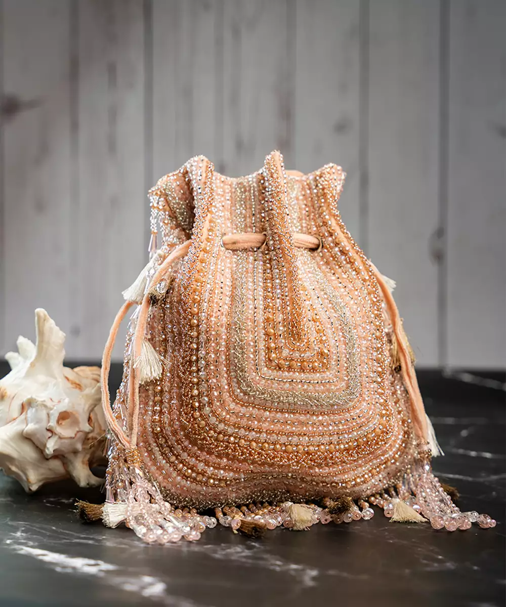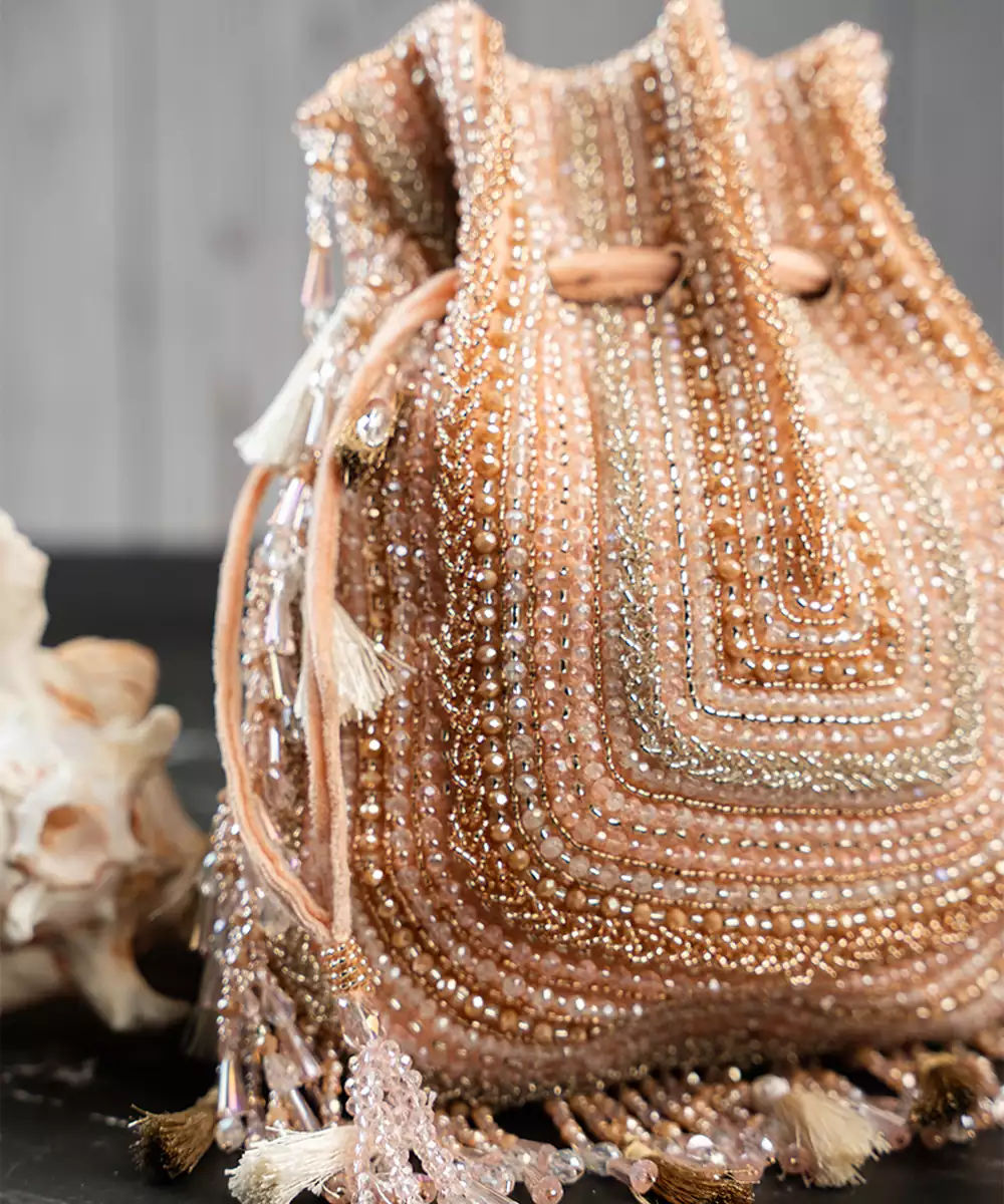 The Baraq Potli Is A Stunning Blend Of Elegance And Craftsmanship, Featuring Lustrous Beads And Intricate Work In A Pink And Gold Palette. Finished With Delicate Tassels, It’s The Perfect Accessory For Weddings, Festive Events, Or Evening Soirées.