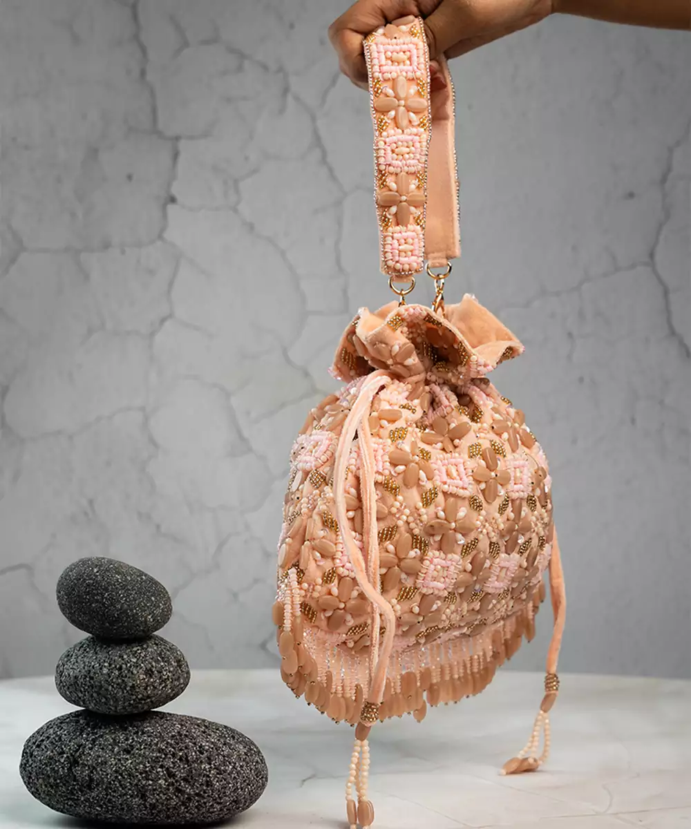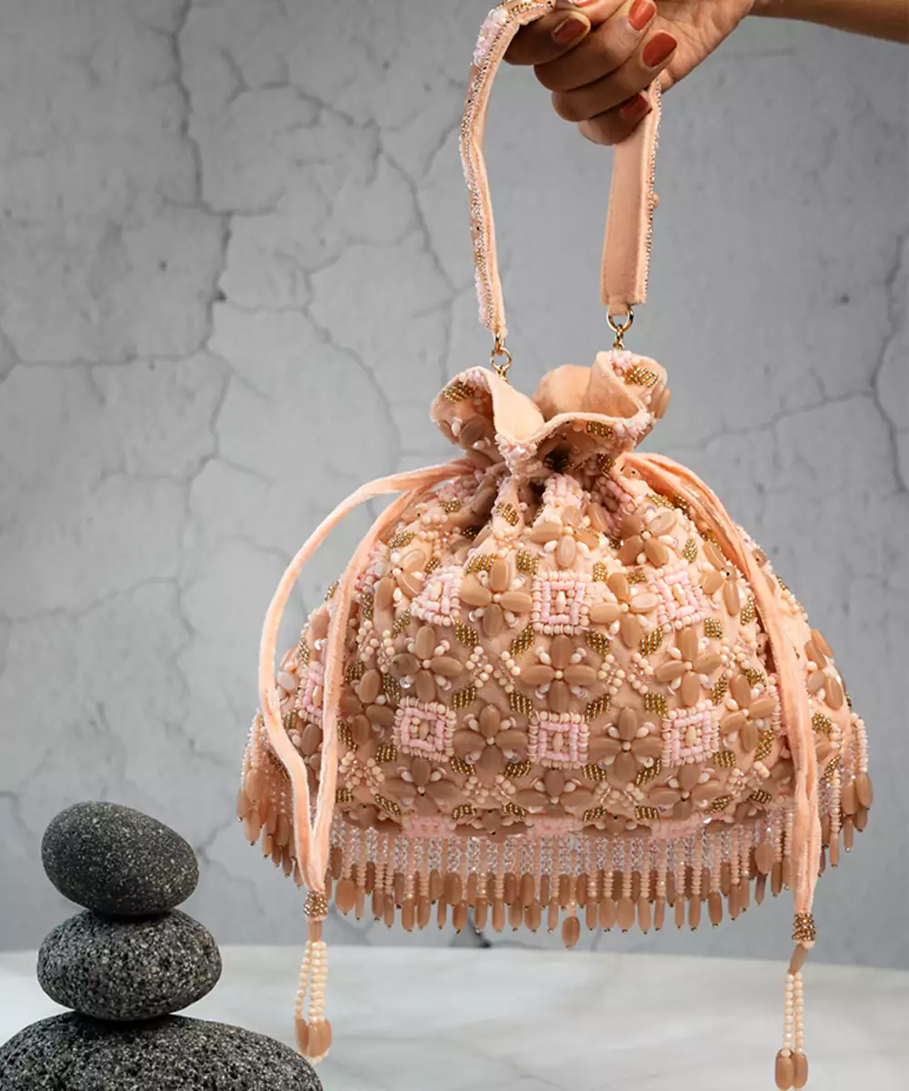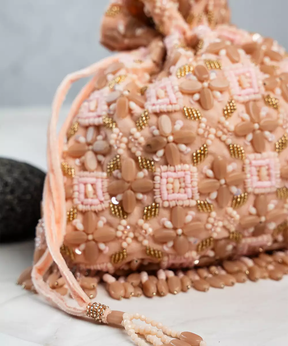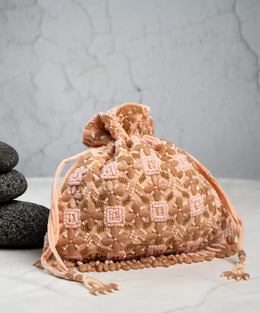 This Tasseled Potli Is A Stunning Blend Of Elegance And Craftsmanship, Featuring Lustrous Beads And Intricate Work In A Pink And Brown Palette. Finished With Delicate Tassels, It’s The Perfect Accessory For Weddings, Festive Events, Or Evening Soirées.