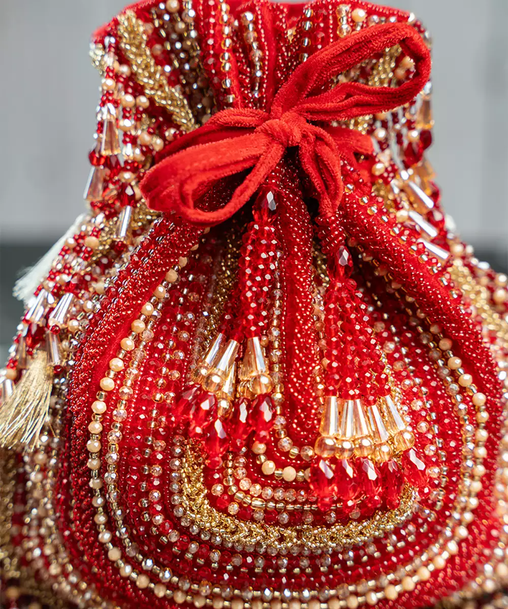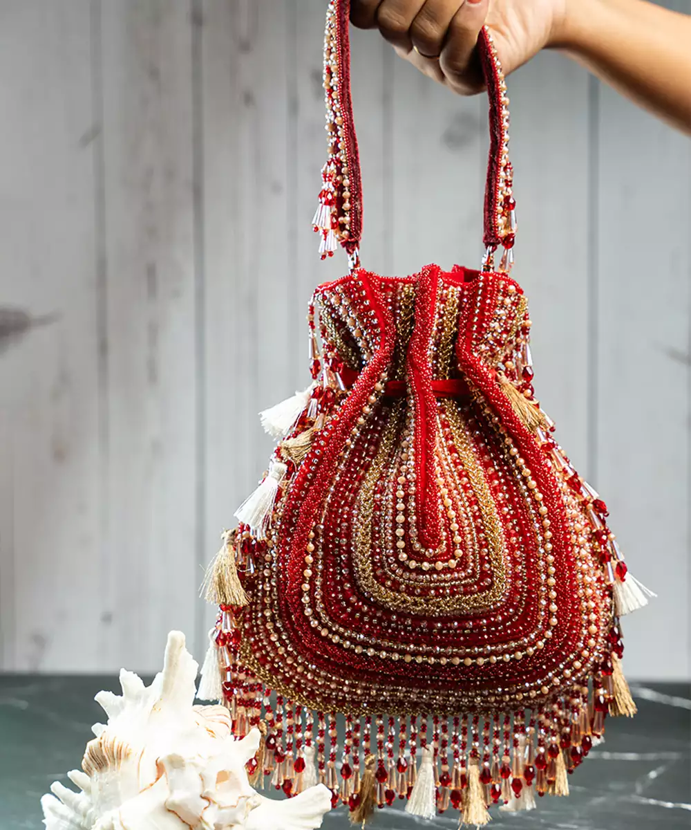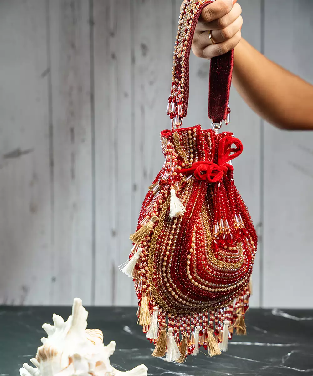 The Baraq Potli Is A Stunning Blend Of Elegance And Craftsmanship, Featuring Lustrous Beads And Intricate Work In A Maroon And Gold Palette. Finished With Delicate Tassels, It’s The Perfect Accessory For Weddings, Festive Events, Or Evening Soirées.