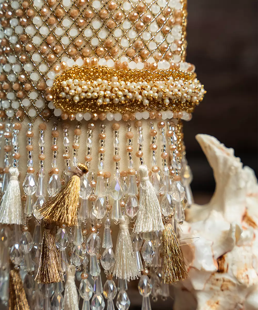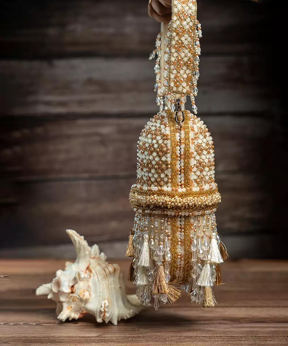 An Incredible Off White Box Clutch Decorated With Pearls N Tassels All Over Making It A Convenient And Fashionable Addition To Any Outfit.