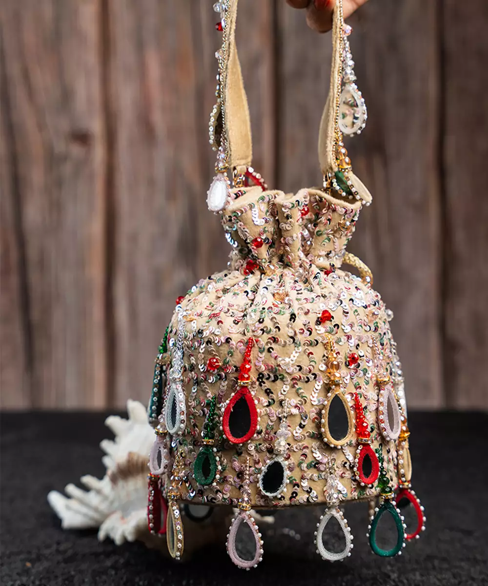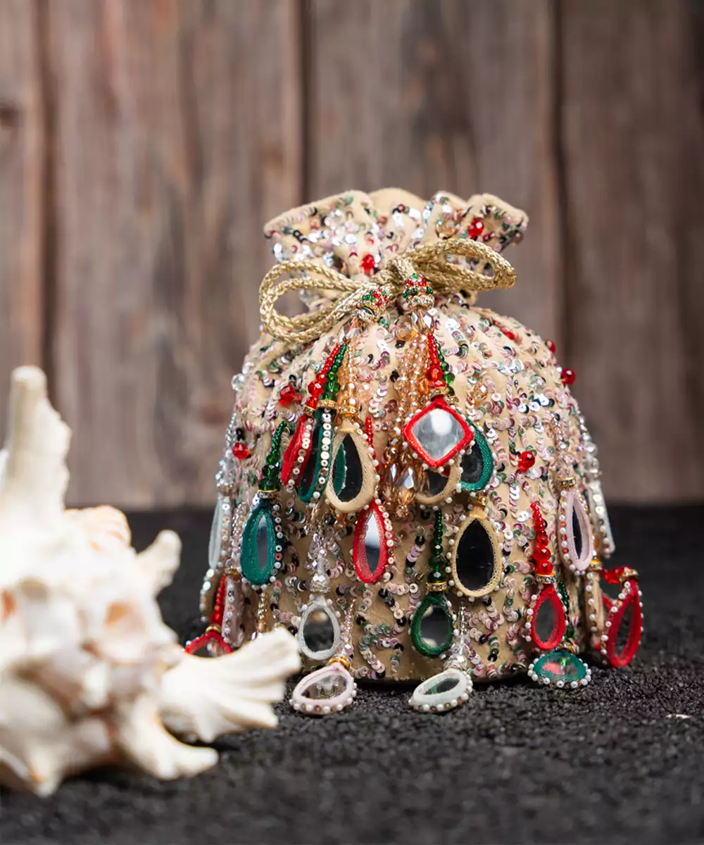 A Stunning Fusion Of Tradition And Style, This Ivory Based Potli Is Adorned With Multi Colored Beads And Mirrors That Create A Vibrant, Eye Catching Design. Accented With Playful Tassels, It’s Perfect For Adding A Colorful Sparkle And Elegant Flair To Any Special Occasion.
