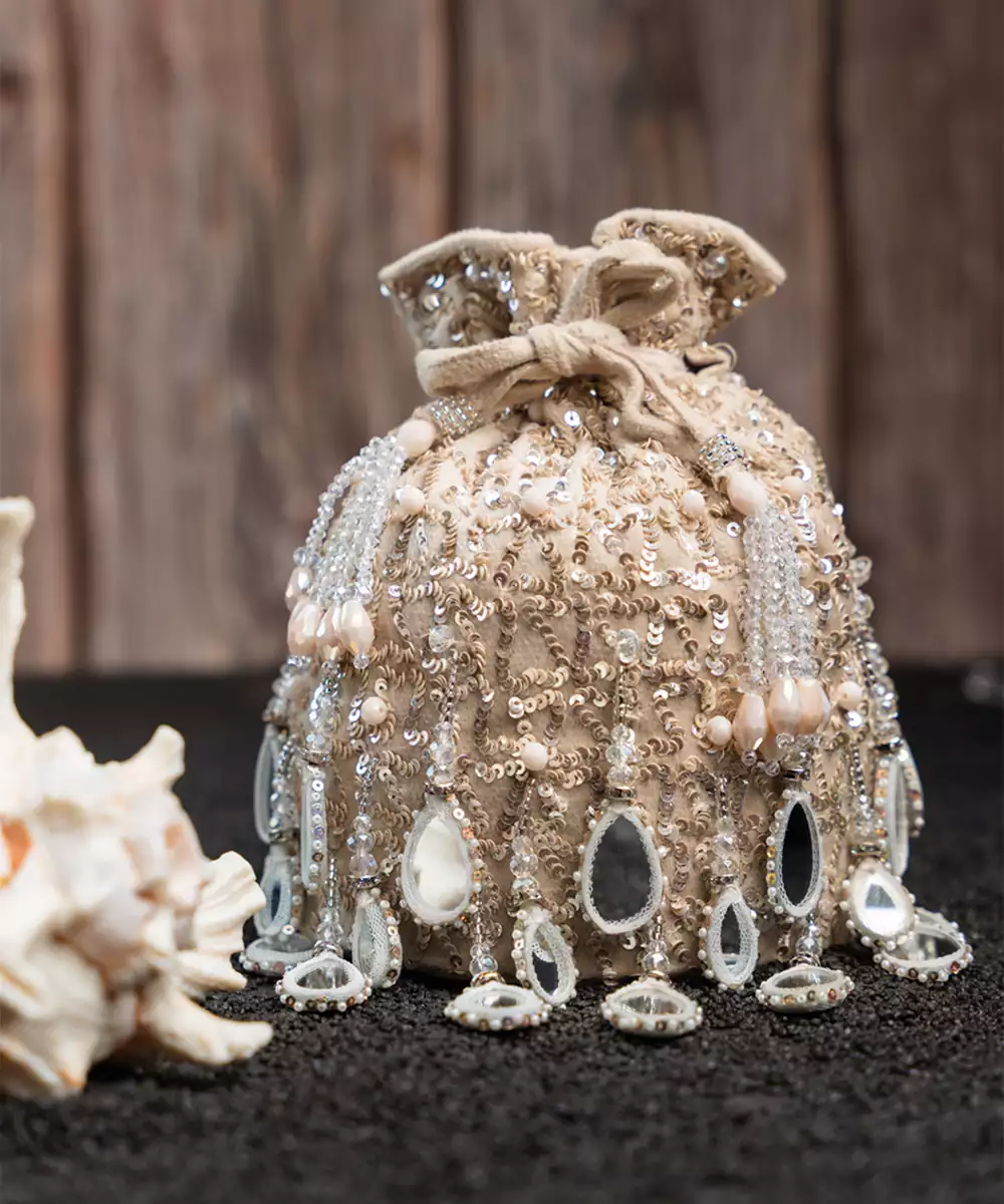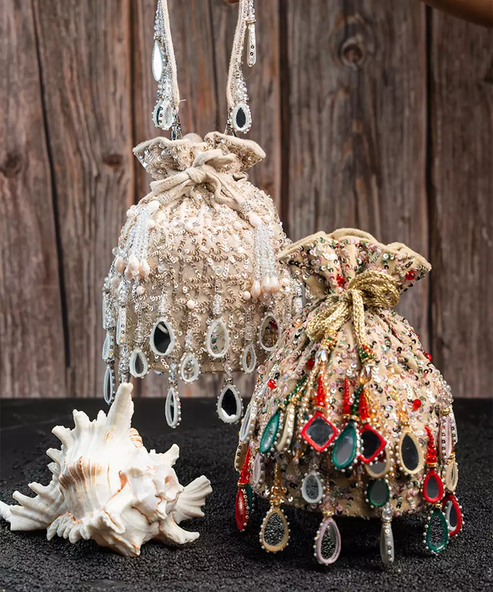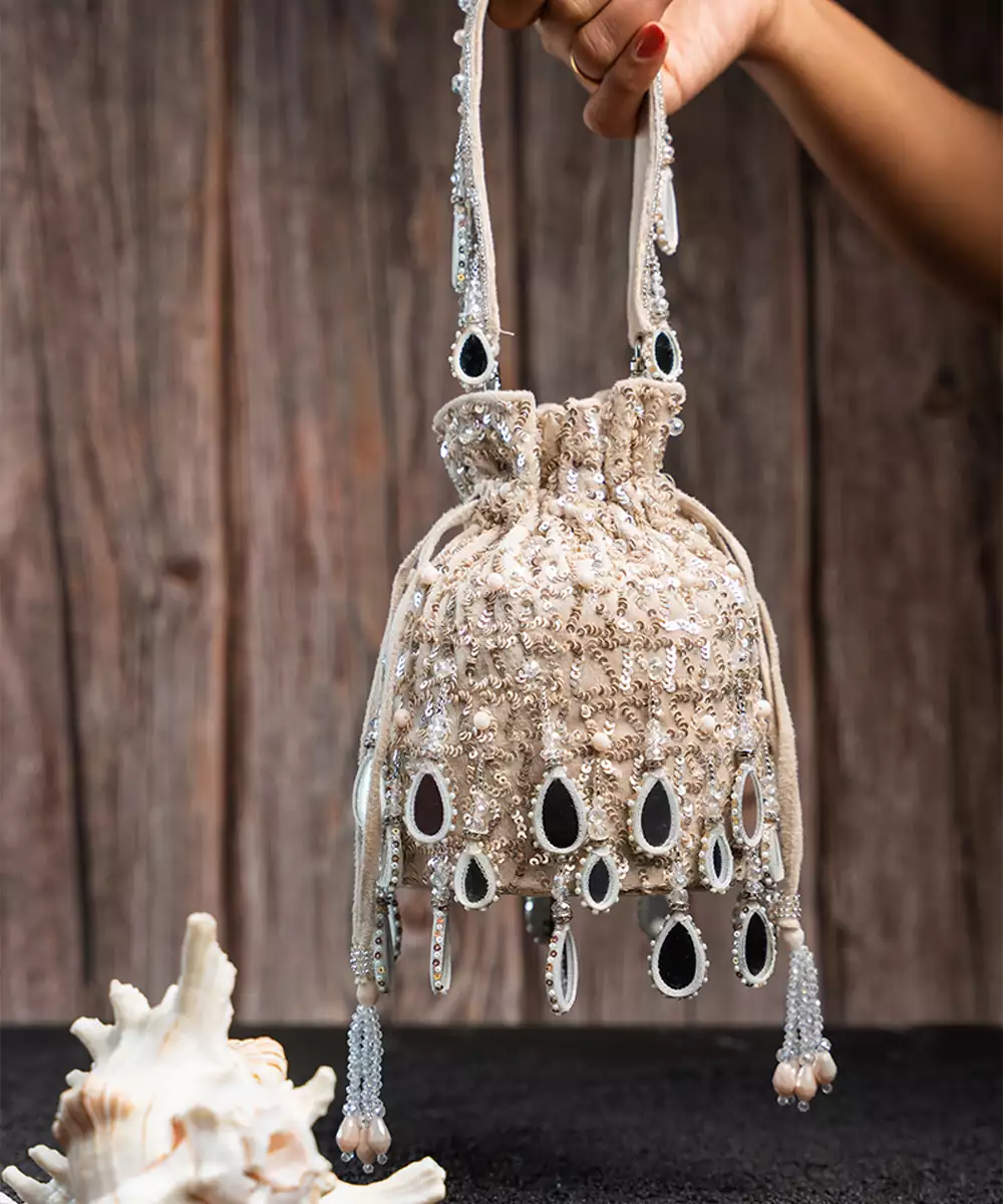 A Stunning Fusion Of Tradition And Style, This Ivory Based Potli Is Adorned With Beads And Mirrors That Create A Vibrant, Eye Catching Design. Accented With Playful Tassels, It’s Perfect For Adding A Colorful Sparkle And Elegant Flair To Any Special Occasion.