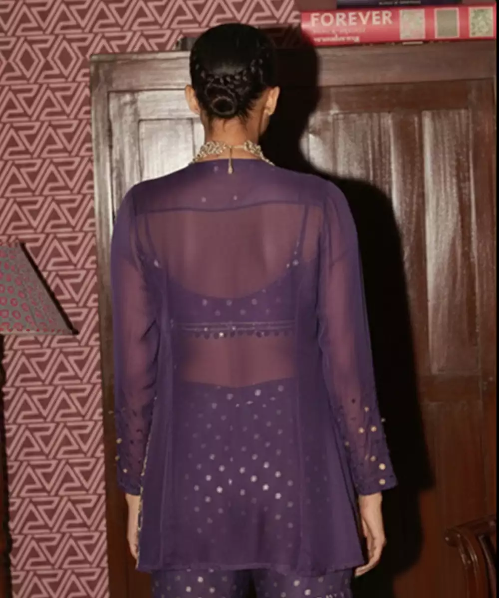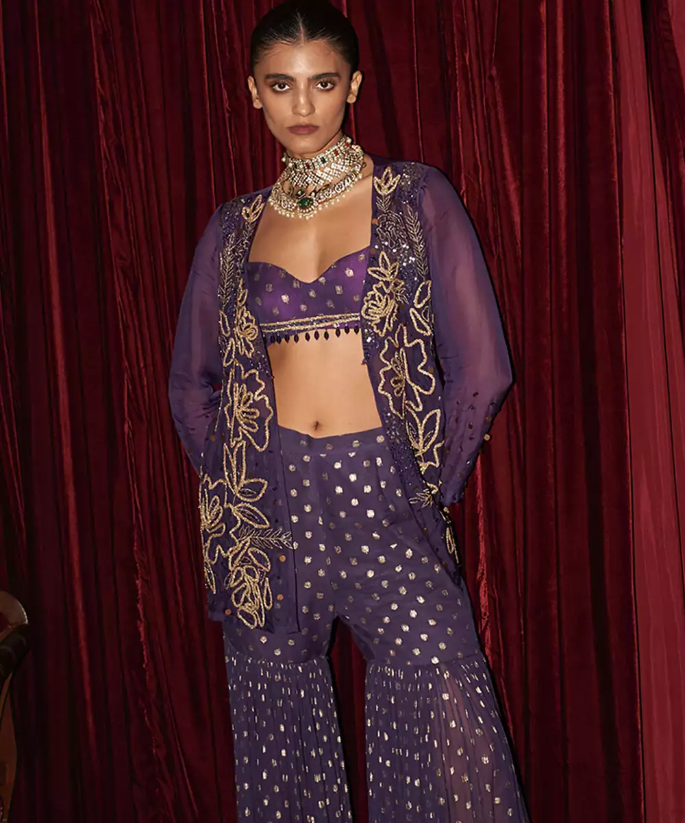 A Regal Purple Gharara Set Crafted In Lightweight Organza And Highlighted With Ornate Embroidery. The Flowing Flare And Rich Hue Create A Striking Festive Look, Making It Suitable For Wedding Functions, Evening Celebrations, And Traditional Gatherings With Royal Charm.